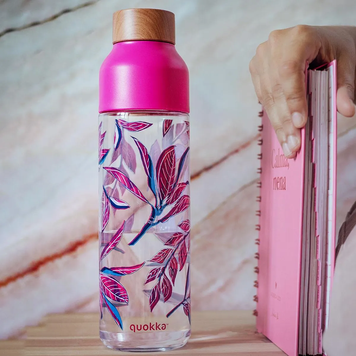 Quokka Bouteille d'Eau Ice 840ml avec Bouchon Bois et Motif Feuillage Stylisé Rose |