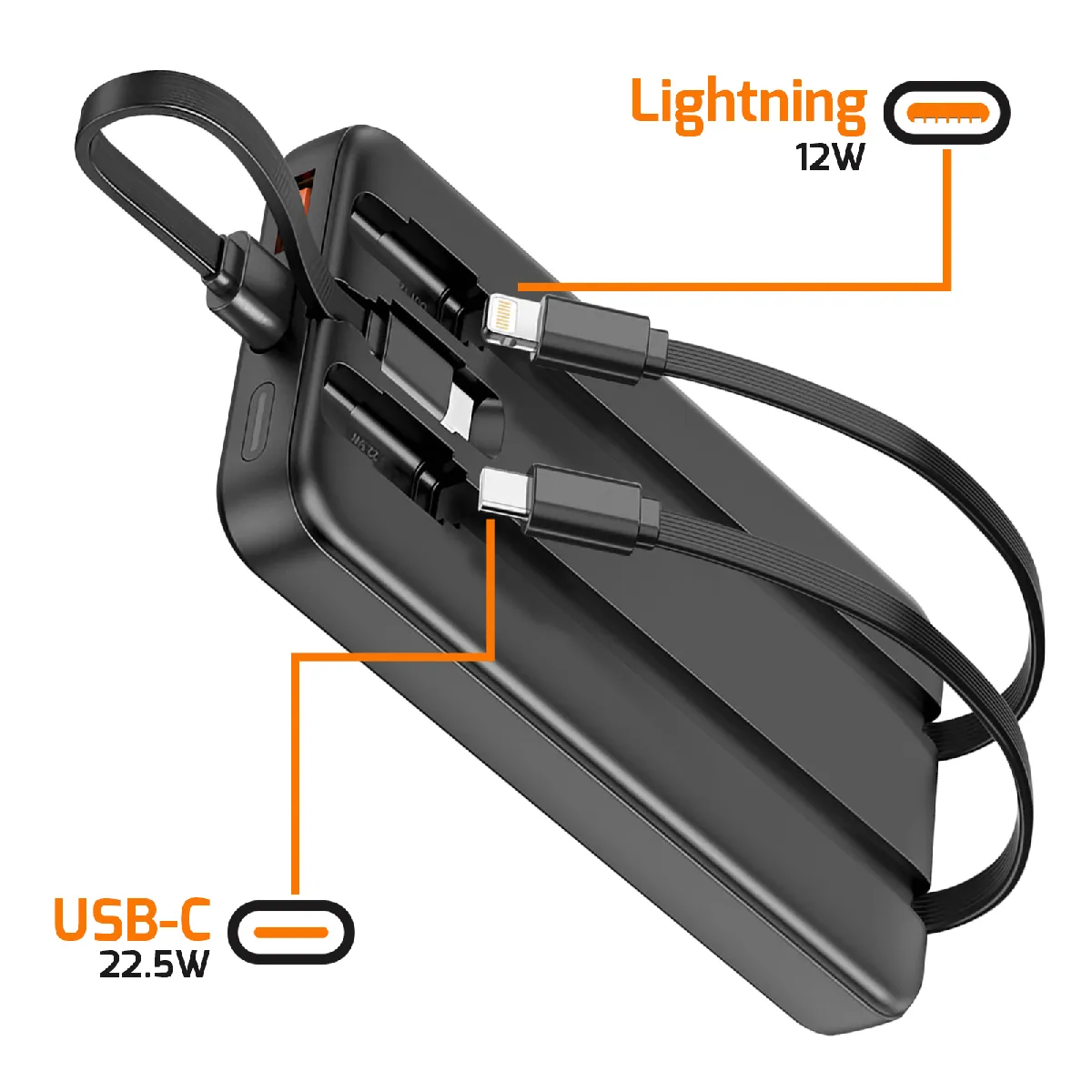 2 câbles intégrés : Lightning (iPhone) + USB-C pour recharge immédiate