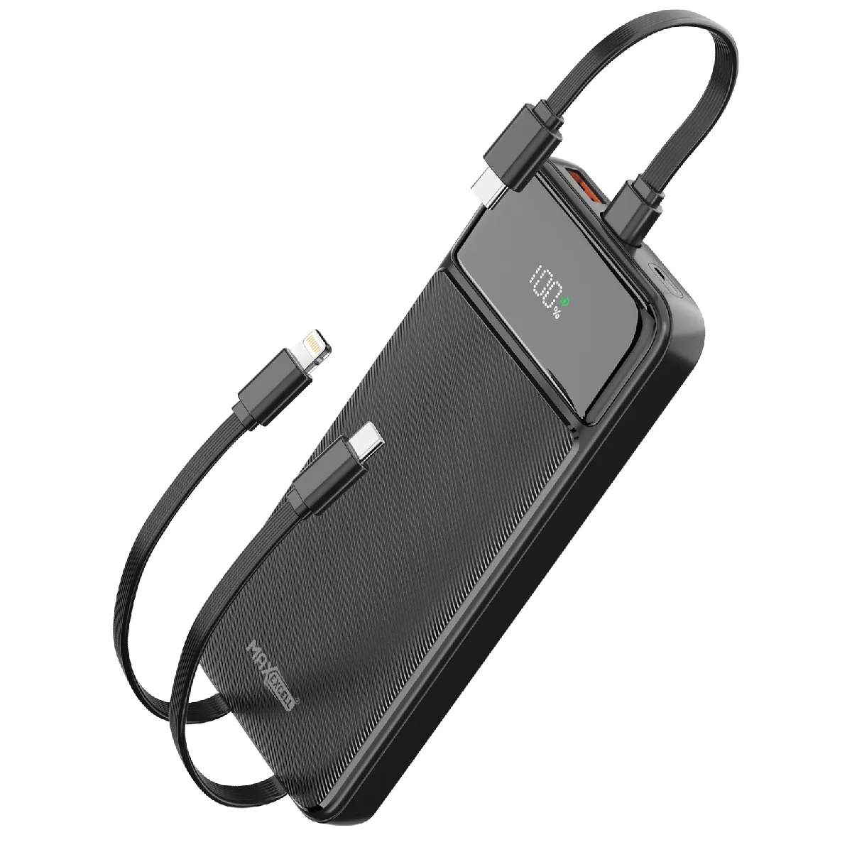 La Powerbank MaxExcell 10 000 mAh allie finesse et performance : équipée de câbles intégrés USB-C et Lightning, elle permet de recharger smartphones, tablettes et accessoires sans circuler entre plusieurs câbles. Ses sorties USB-C et USB, son format ultra-slim et son écran LED d'état en font un compagnon nomade idéal pour rester prêt à tout moment.