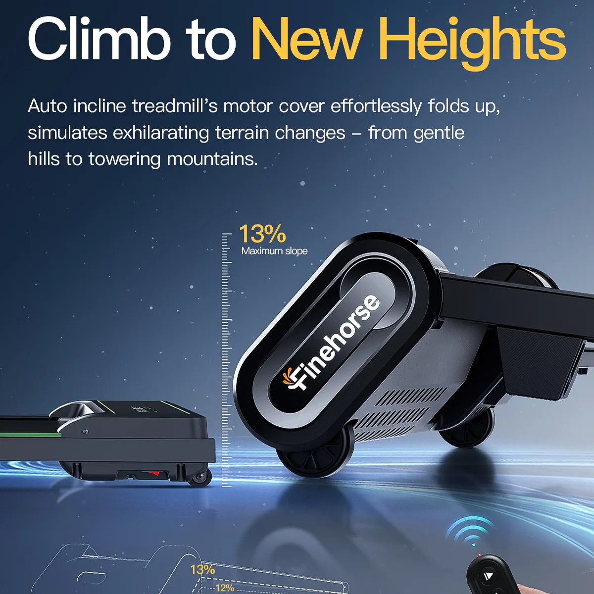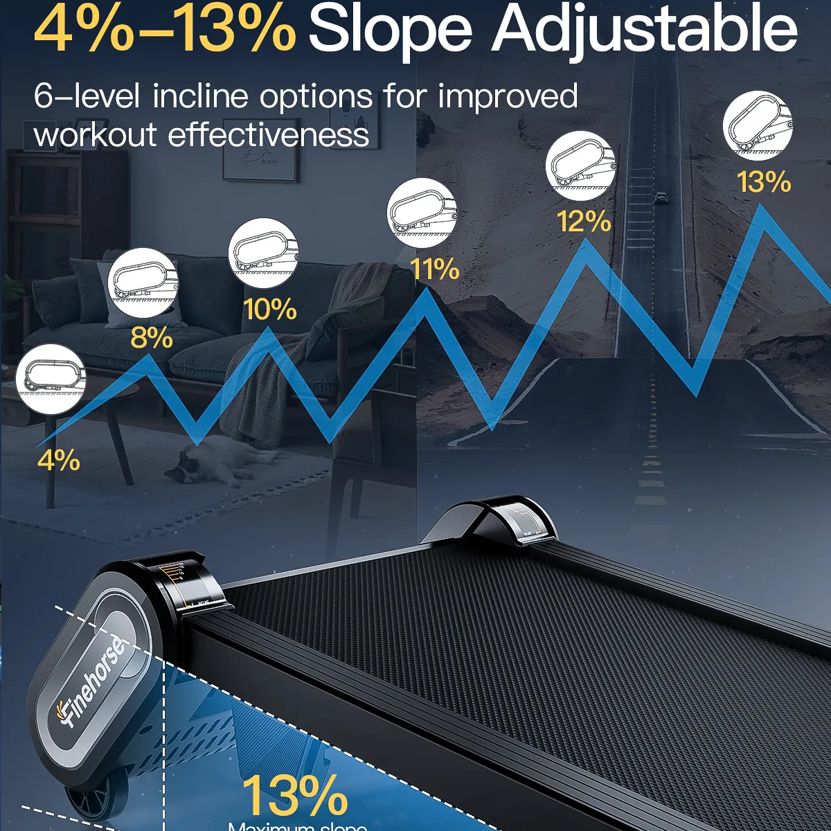 Doté d'un système d'inclinaison automatique de 4 % à 13 %, le FINEHORSE H1 simule la marche en montée pour augmenter la dépense calorique, améliorer l'endurance et optimiser vos séances de marche quotidiennes, sans augmenter la vitesse.
