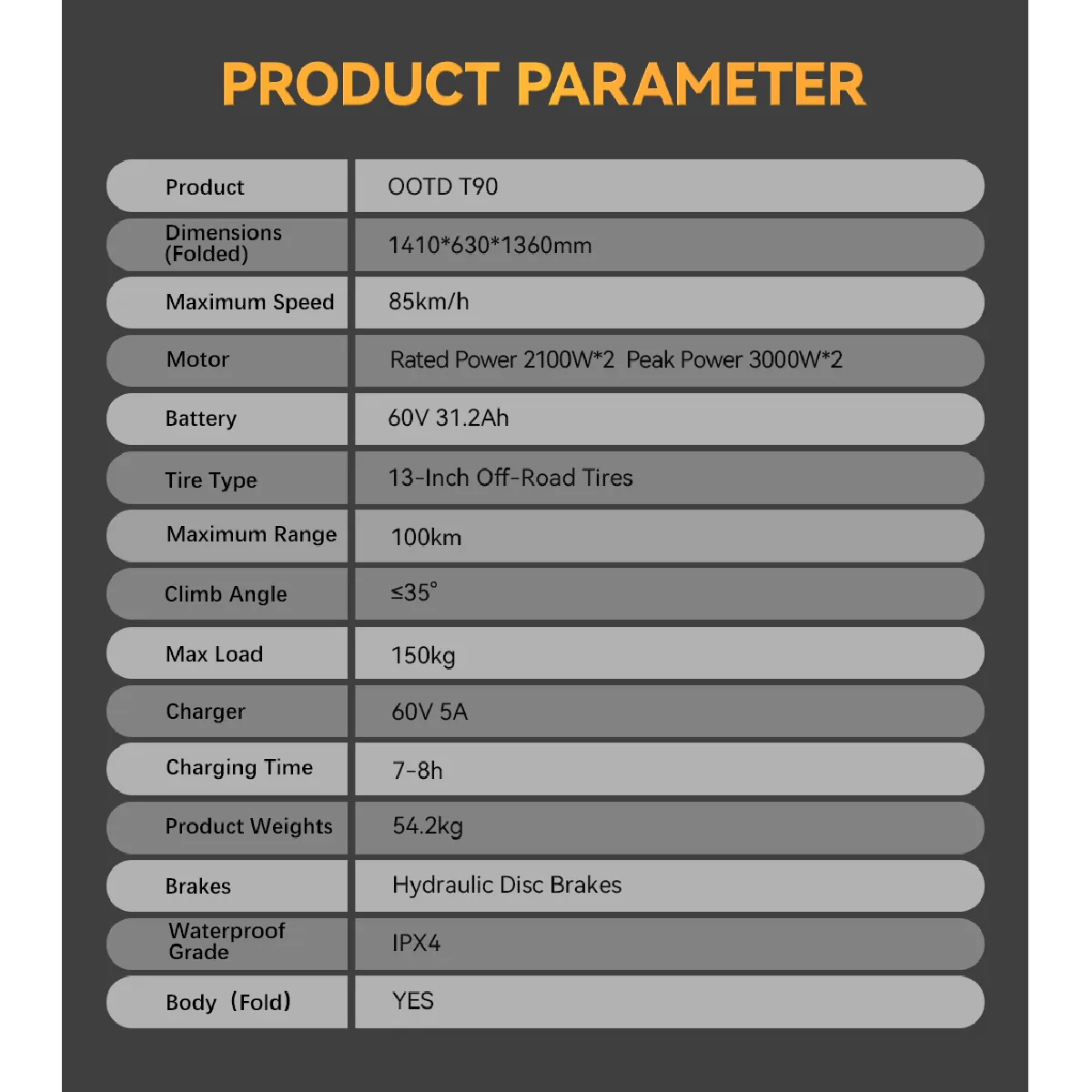 Deux moteurs de 3000 W (puissance maximale) pour une puissance irrésistible : La OOTD T90 est équipée d'une combinaison révolutionnaire de deux moteurs de 3000 W (puissance maximale), avec une puissance indépendante pour chaque roue, offrant une puissance totale incroyable.