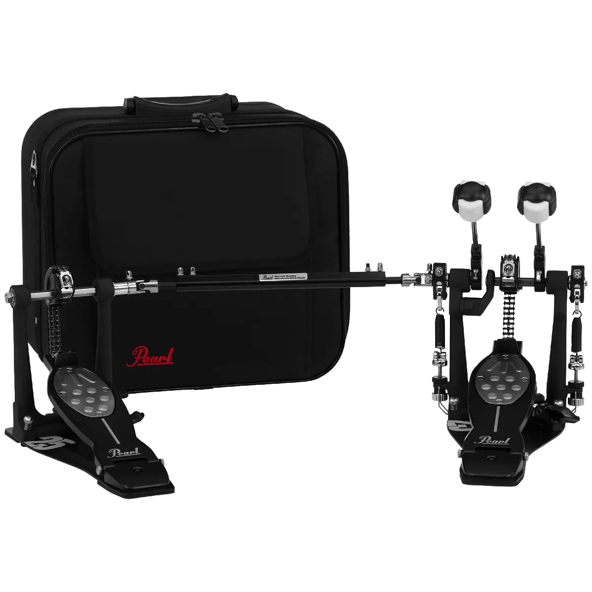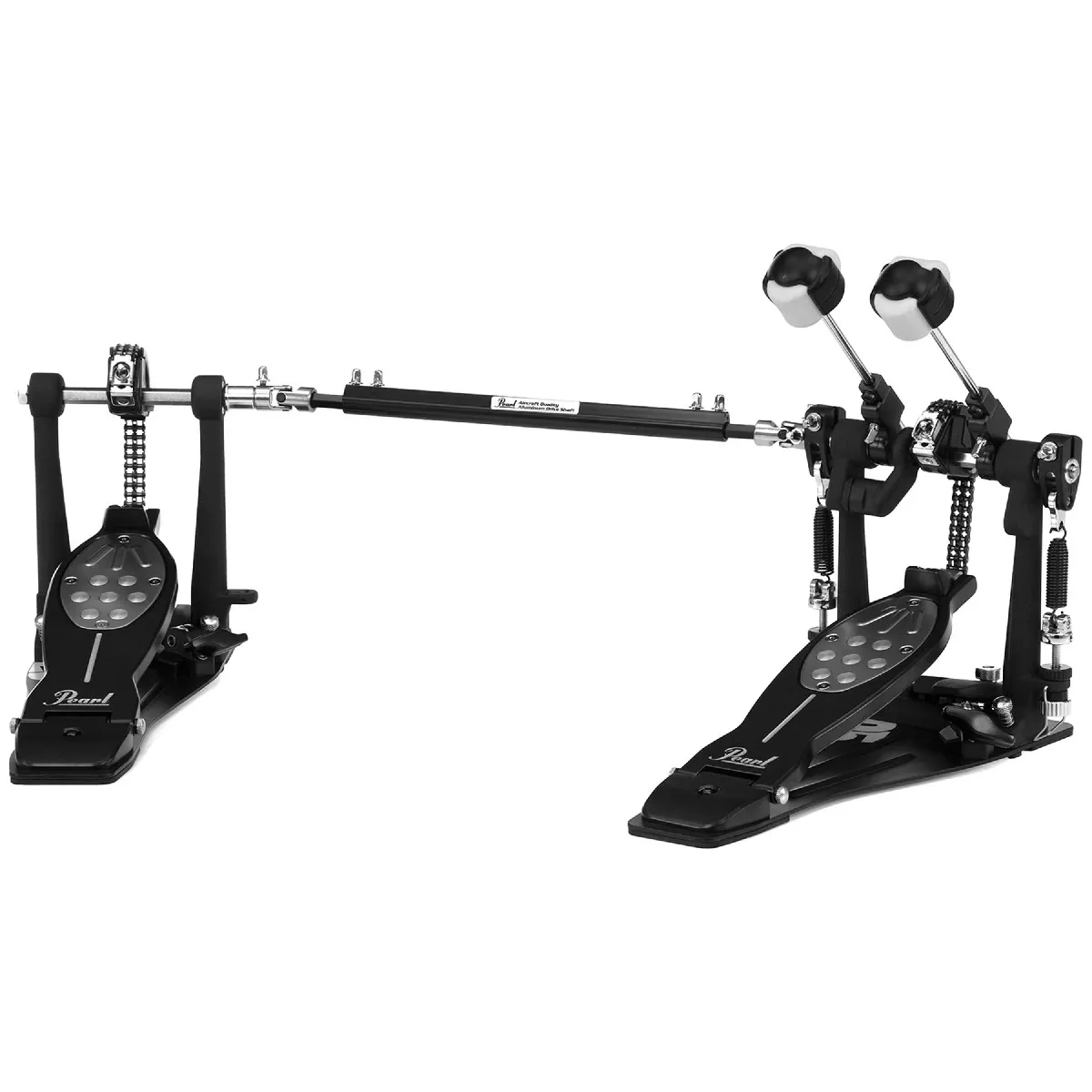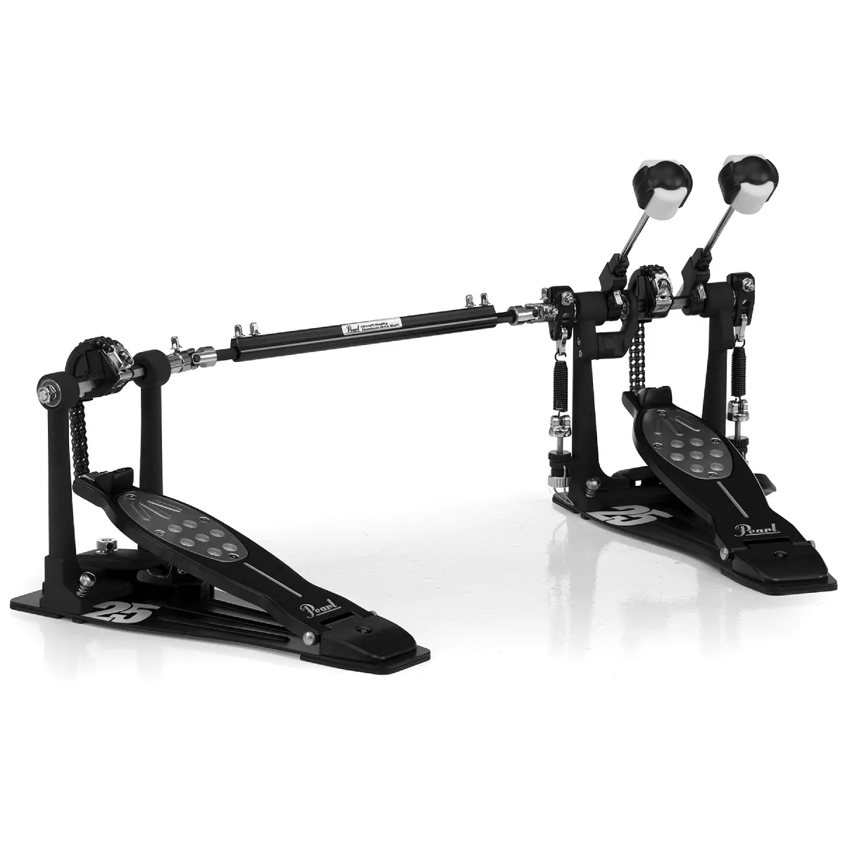 Pédale double Pearl Eliminator P-2052C/B 25th Anniversary, édition limitée noir satiné, transmission double chaîne, système de cames interchangeables, fonction PowerShifter, batte Quadbeater Control Core, livrée avec étui.