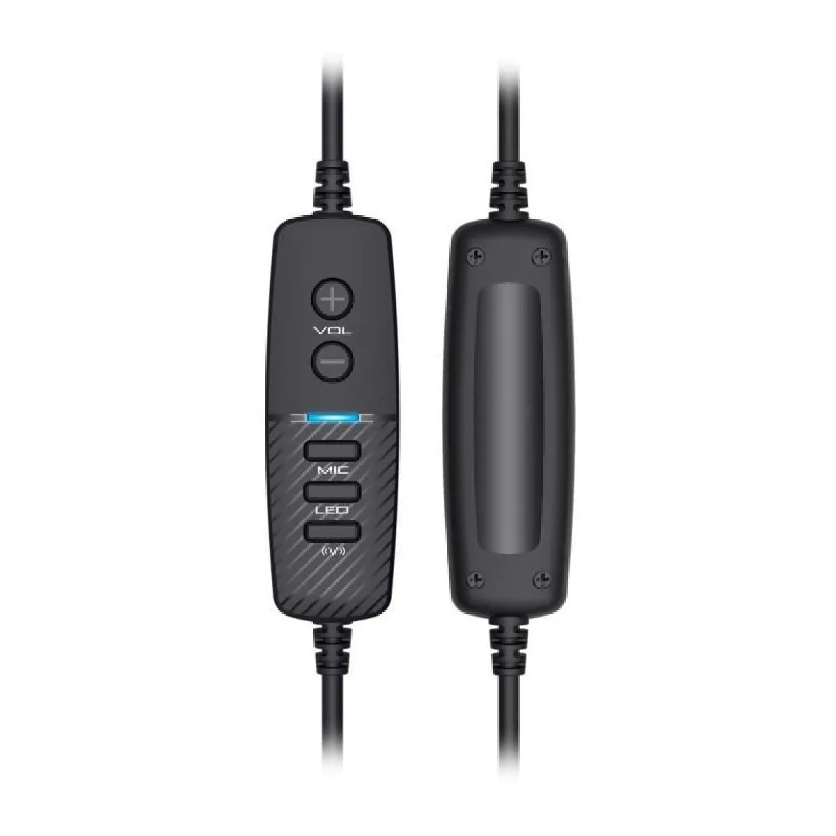 - Télécommande en ligne : Contrôles intégrés pour le volume, la coupure du micro, la gestion du rétroéclairage (boutons indiqués MIC, LED et (V)) et indicateur LED bleu sur la télécommande.
