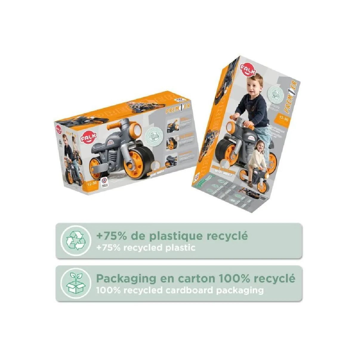 FALK Draisienne Moto Premier rétro gris - dès 12 mois - fabriquée en France, 75% plastique recyclé, roues silencieuses antidérapantes