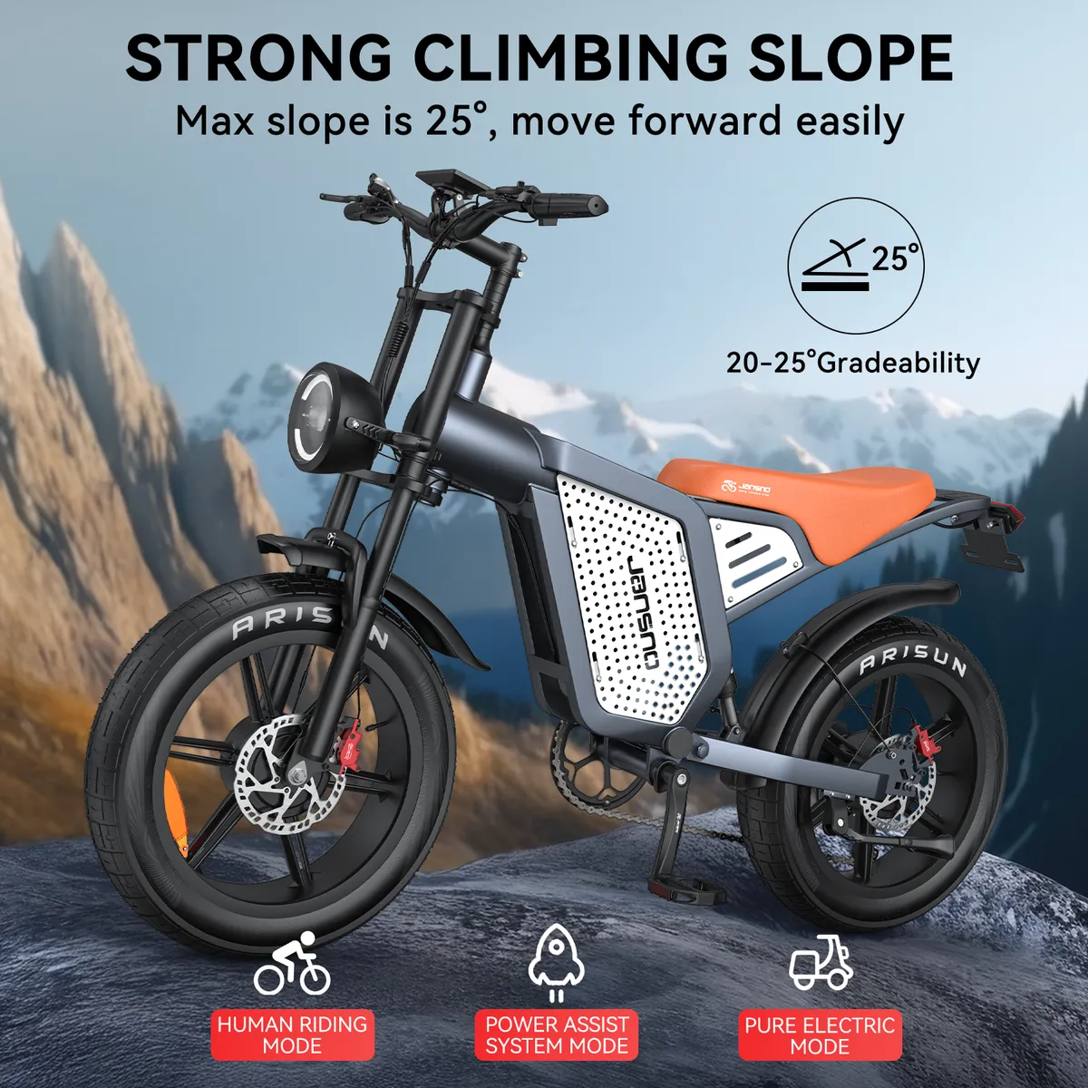 Equipé de freins hydrauliques à disque offrant une distance de freinage de 3.5 à 7 mètres, le Jansno X60 garantit un arrêt sûr et précis même à haute vitesse (jusquà 48 km/h). Associés aux pneus anti-dérapants 20×4.0, ces freins améliorent la traction sur routes mouillées ou irrégulières, réduisant le risque daquaplanage et renforçant la sécurité globale.