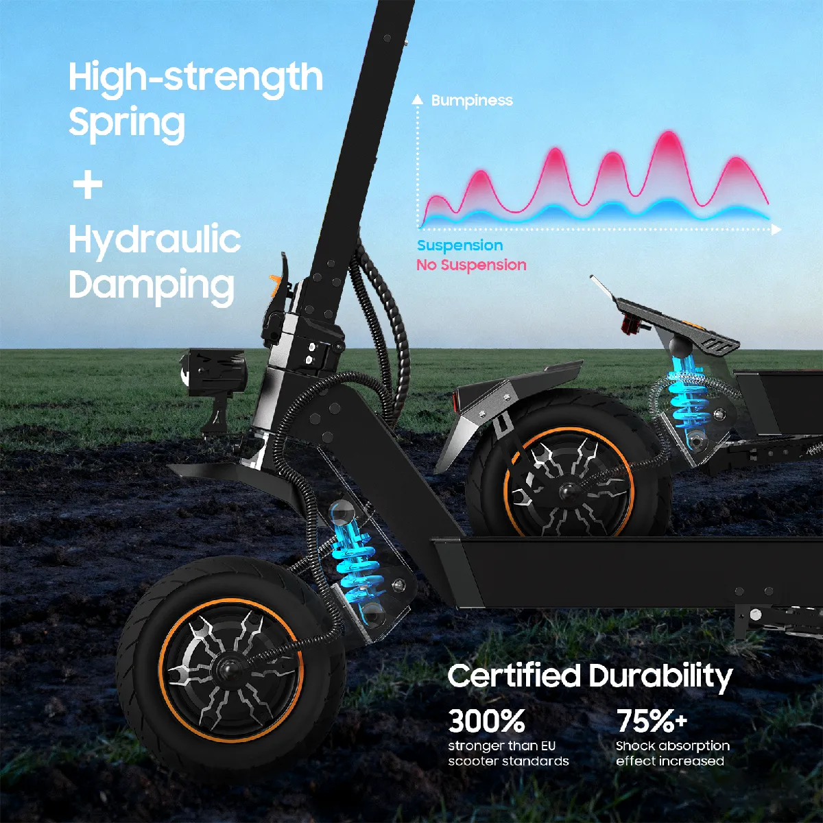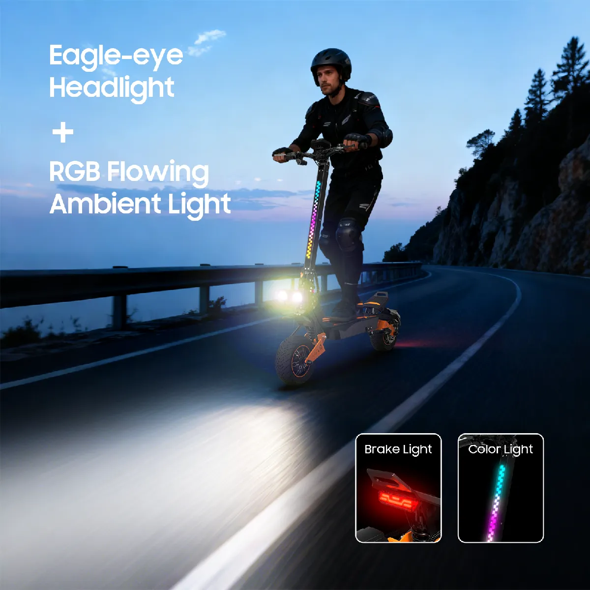 Prenez la route en toute confiance. L'éclairage complet inclut deux phares avant ultra-puissants, des feux stop automatiques, des clignotants ambrés et un éclairage ambiant multicolore. Le tableau de bord LCD centralise les données. Les pneus pneumatiques 11 pouces et la suspension hydraulique assurent confort et stabilité sur tous les terrains.