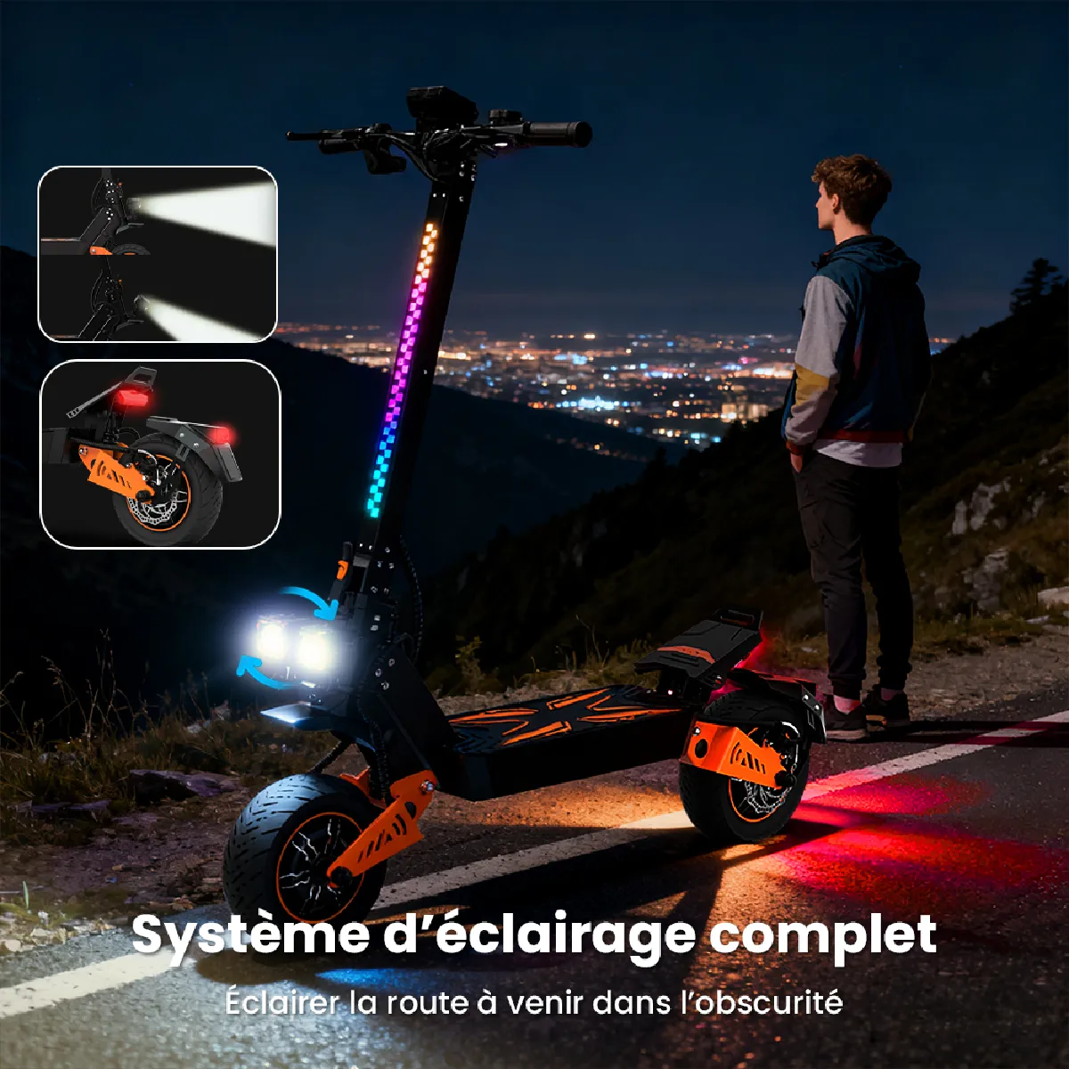 Prenez la route en toute confiance. L'éclairage complet inclut deux phares avant ultra-puissants, des feux stop automatiques, des clignotants ambrés et un éclairage ambiant multicolore. Le tableau de bord LCD centralise les données. Les pneus pneumatiques 11 pouces et la suspension hydraulique assurent confort et stabilité sur tous les terrains.
