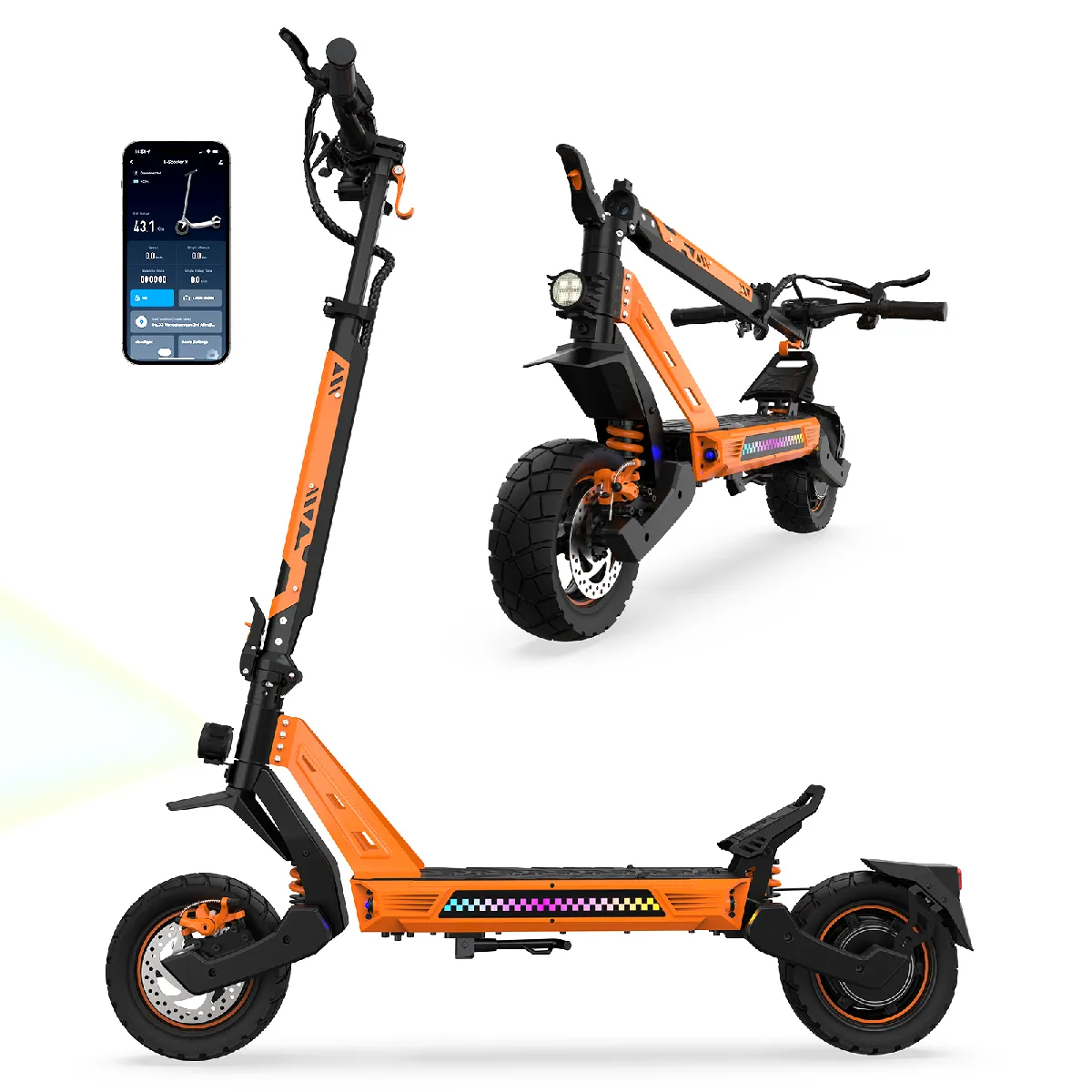 Système d'éclairage complet : phare principal intégrant un avertisseur sonore, feux arrière avec fonction de freinage, clignotants aux 4 coins du plateau, et éclairage d'ambiance multicolore sur les côtés. Application mobile intelligente avec verrouillage à distance, alarme antivol et surveillance de l'état de la trottinette.