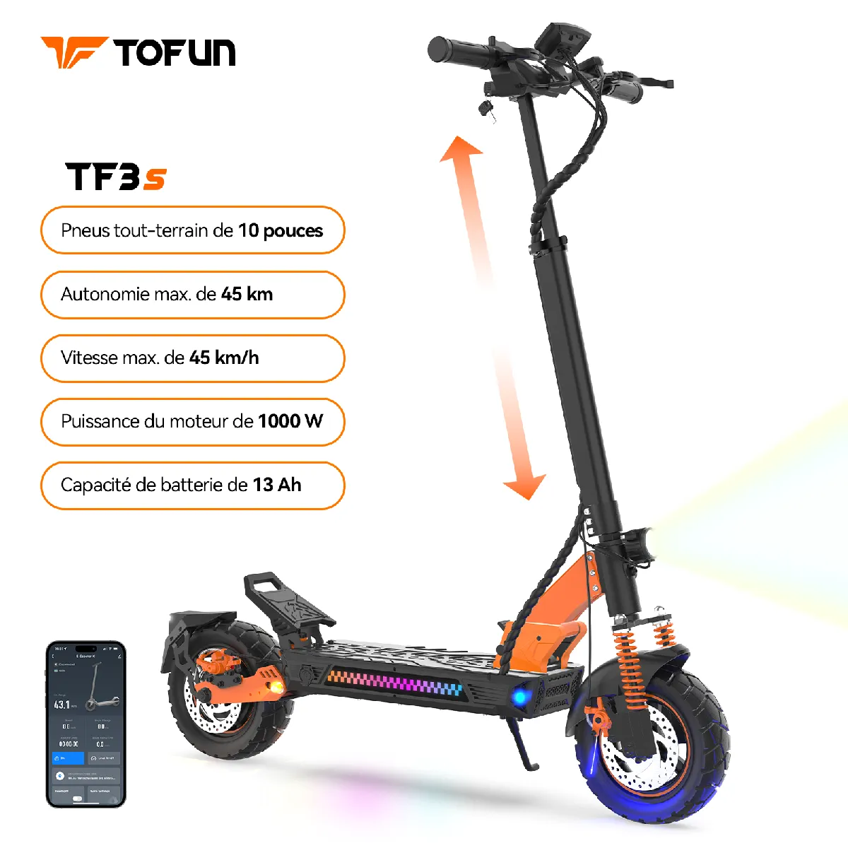 TOFUN Trottinette électrique pour adultes, 1000W Tout-terrain Rapide, Hauteur réglable, Pliable pour Trajets Pendulaires avec Application et Feux de Direction, Vitesse max 45 km/h, Autonomie max 45 km
