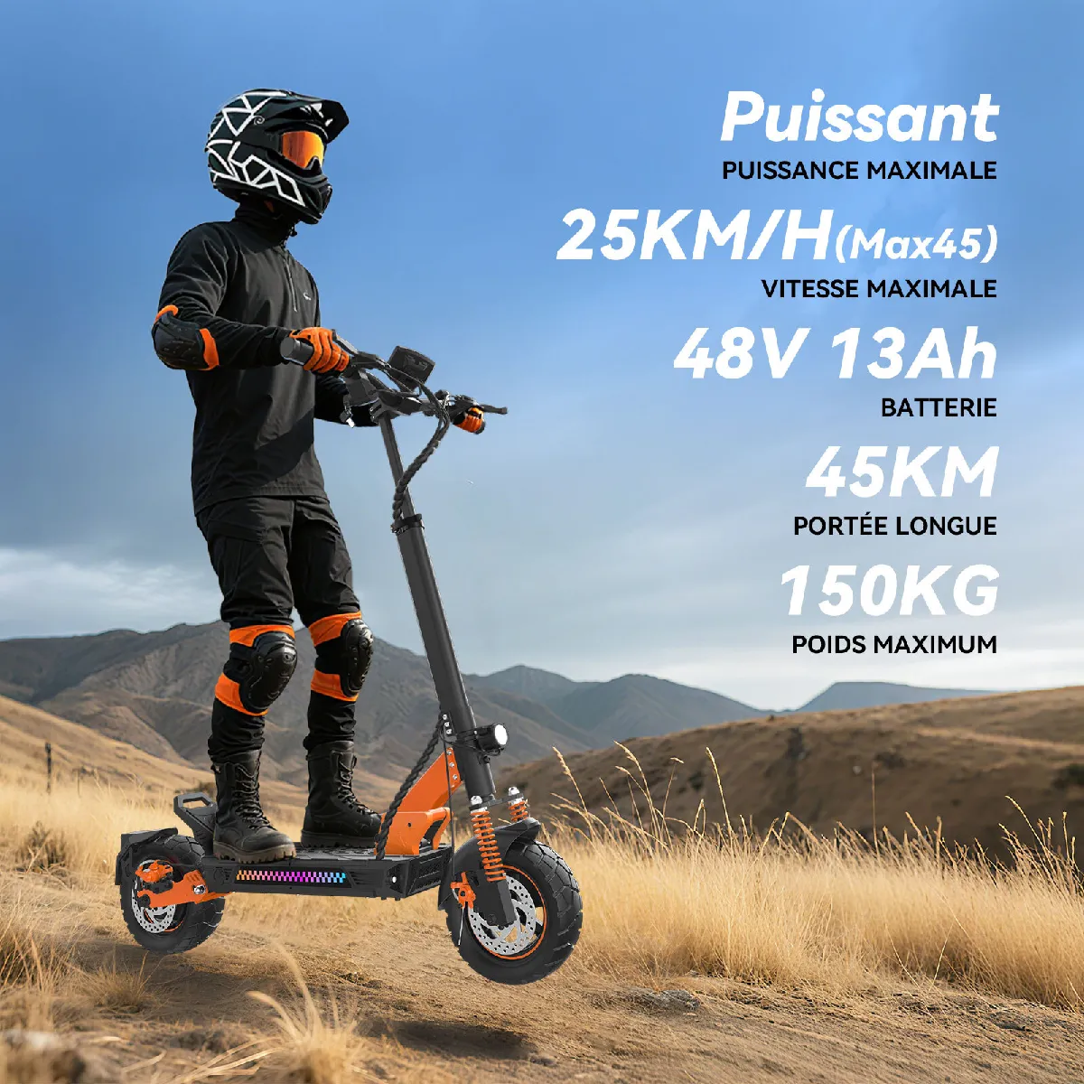 Profitez d'une accélération vive et gravissez des pentes jusqu'à 25° grâce au moteur brushless puissant de 1000W. La batterie haute capacité vous offre une autonomie étendue jusqu'à 45 km*, idéale pour les trajets du quotidien comme pour l'exploration.