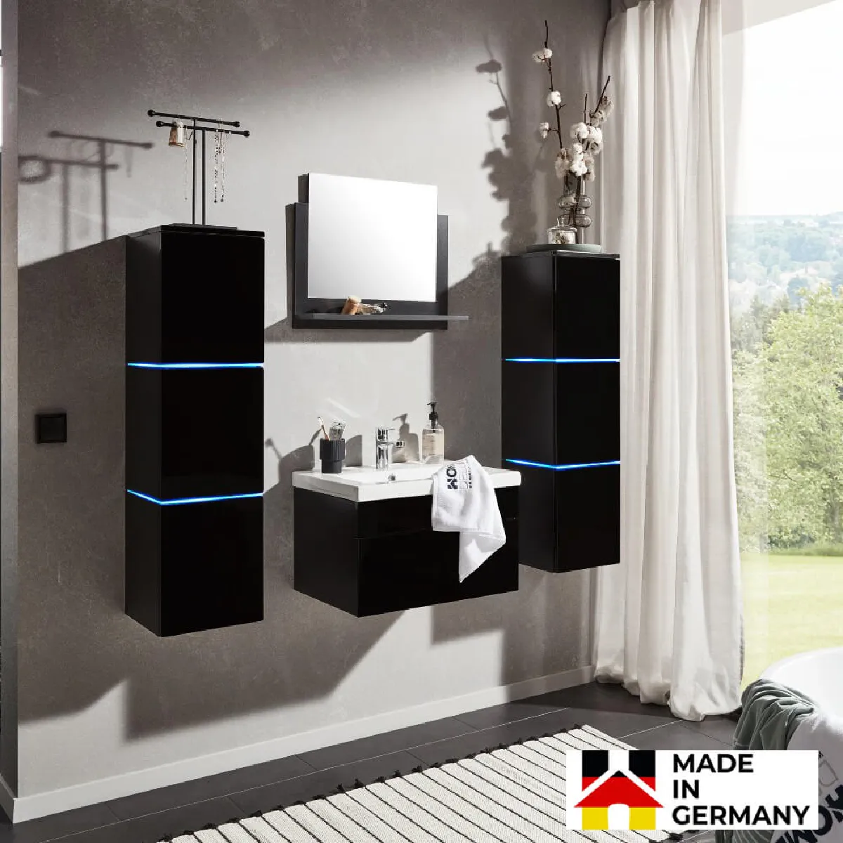 * Façades laquées brillantes, côtés en mélamine noire mate