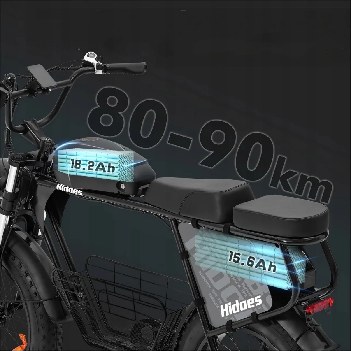 Commentaire vendeur : Le vélo électrique Hidoes B9 se distingue par son autonomie exceptionnelle grâce à un système de double batterie 48V (33.8Ah total), offrant 80-90 km en mode électrique pur et jusqu’à 150 km en assistance pédale, rechargeable en 6-9 heures avec deux chargeurs inclus. Son moteur 750W (couple 65Nm) délivre une vitesse de 40 km/h (déverrouillée) ou 25 km/h conforme, associé à un système Shimano 7 vitesses pour une transmission fluide sur tous terrains. Conçu pour la polyvalence urbaine, il dispose d’un long siège triple, d’un panier avant et d’un porte-bagages arrière, supportant une charge maximale de 150 kg. Sa sécurité est optimisée par des freins hydrauliques avant-arrière, une protection IP54 et un écran LCD intelligent, tandis que ses pneus tout-terrain 20" x 4.0" garantissent une adhérence exceptionnelle sur sols irréguliers. Alliant durabilité et design moderne, il est parfait pour les trajets quotidiens et les aventures en plein air.