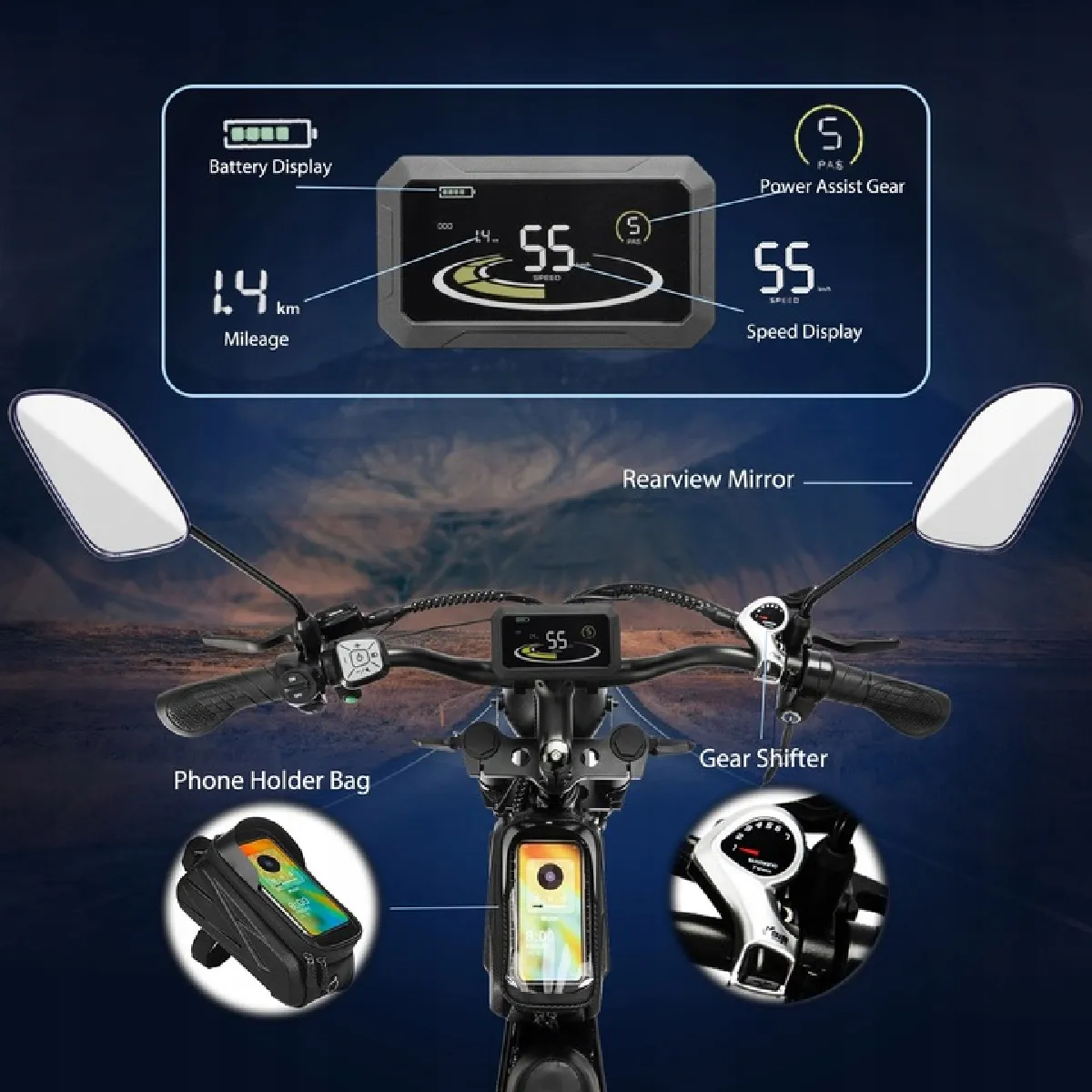 Son moteur sans balais 2000W (moc pique 3000W) délivre une propulsion dynamique, atteignant une vitesse maximale de 55km/h. Associé à la transmission Shimano 7 vitesses, il surmonte facilement les terrains accidentés et les pentes, offrant une expérience de conduite sportive et réactive pour les aventures outdoor.
