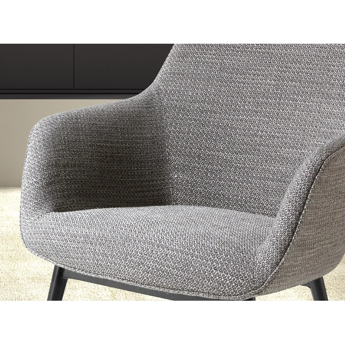 Chaise en tissu gris Angel Cerdá modèle 4222 avec accoudoirs, assise et dossier tapissés. Pieds en acier inoxydable peint époxy noir. Rembourrage mousse polyuréthane 25 kg/m3. Dimensions : 65 x 68 x 85 cm, hauteur d'assise 49 cm.