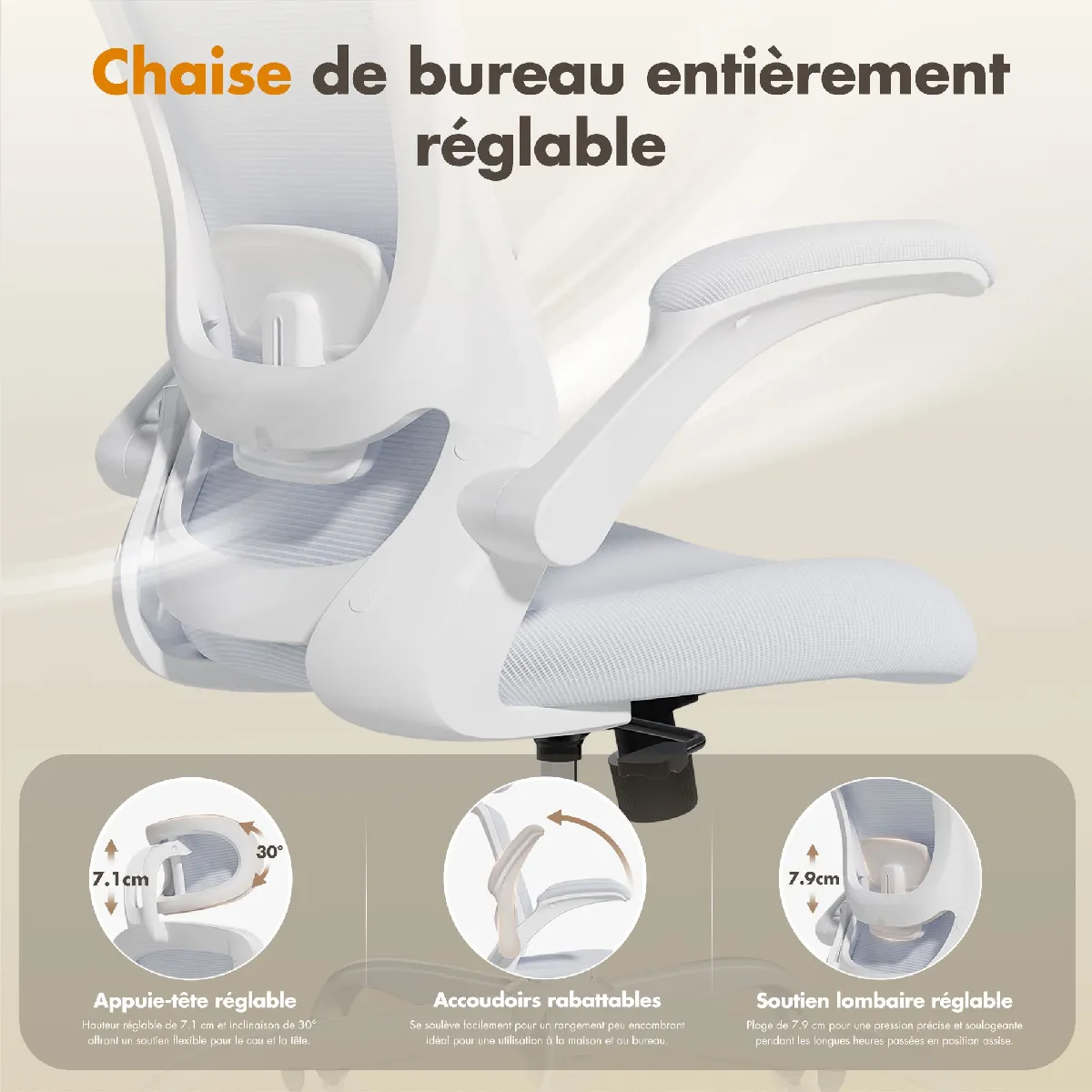 Smartue Chaises de bureau - Chaise de bureau ergonomique – Dossier haut en mesh, soutien lombaire et appuie-tête réglables, accoudoirs relevables – blanc |