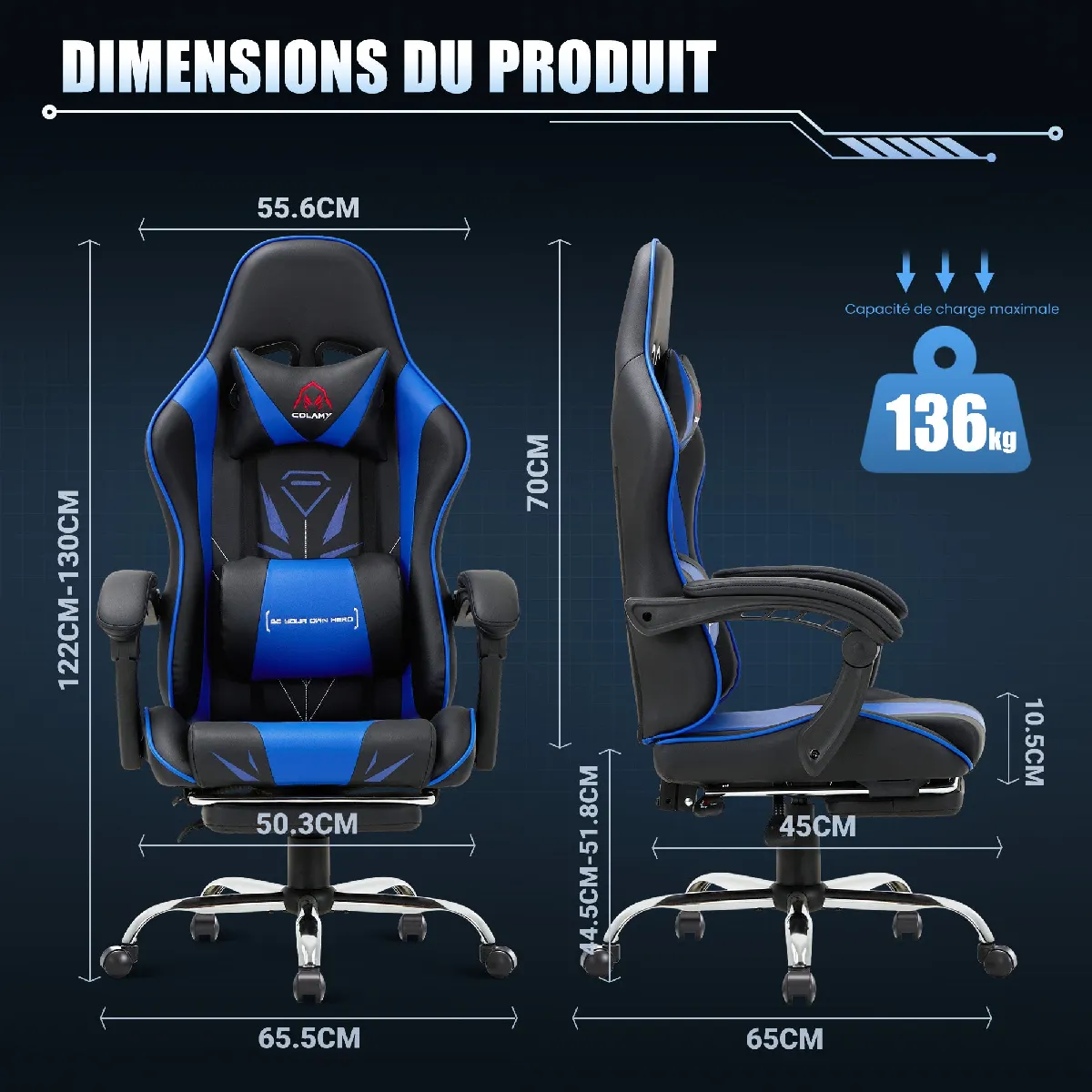 Chaise gaming ergonomique avec dossier haut, appui-tête et repose-pieds rétractable. Base ultra-stable jusquà 136KG. Parfaite pour jouer, travailler ou se détendre. Alliez performance, confort et design pour chaque session de jeu. Ne manquez pas lexpérience ultime !Applications multiples :