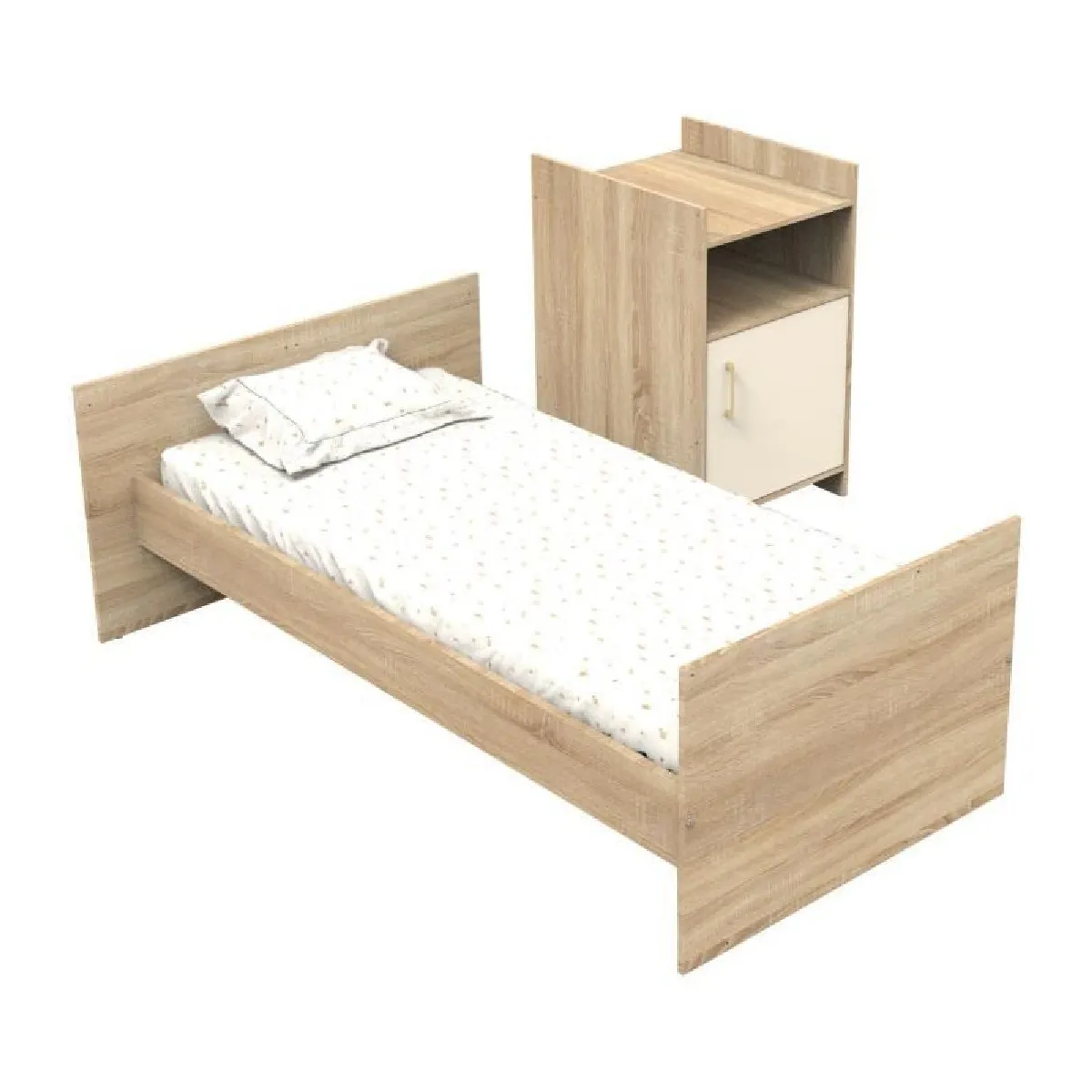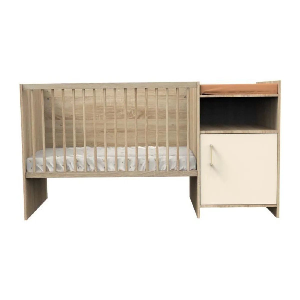 La commode intégrée avec étagères et porte, réalisée en panneaux de particules mélaminés décor chêne doré et crème, optimise l'espace de la chambre en offrant un rangement pratique et esthétique pour les affaires de bébé.