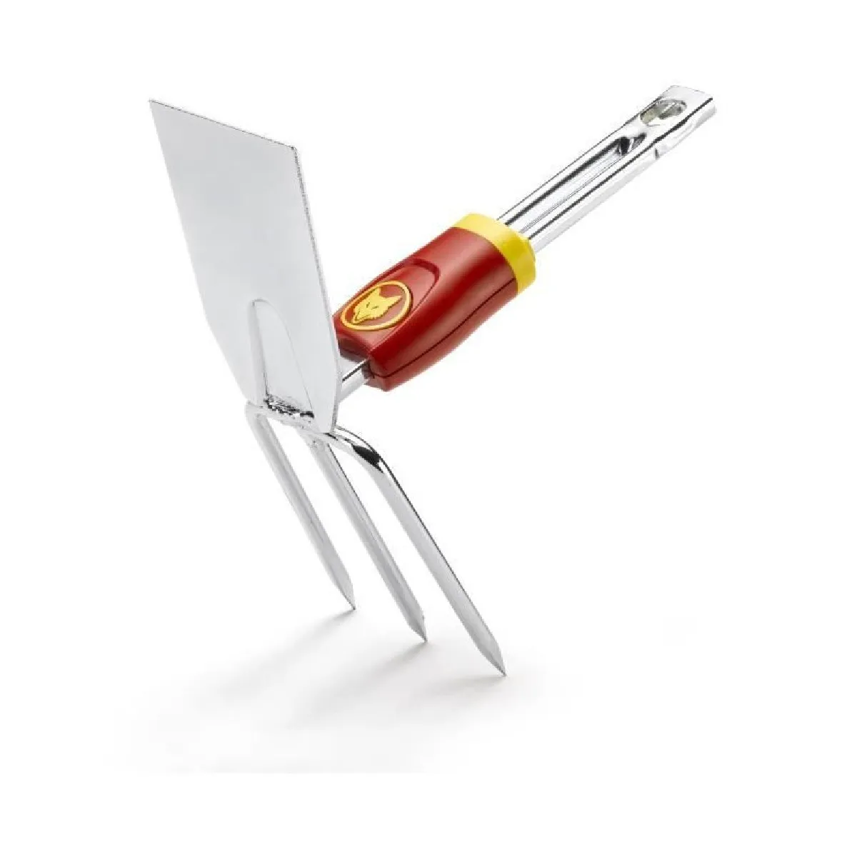 Cette petite serfouette combine une panne droite de 8 cm pour enlever les mauvaises herbes et trois dents pointues qui ameublissent la terre en profondeur, facilitant le semis et l'aération du sol.