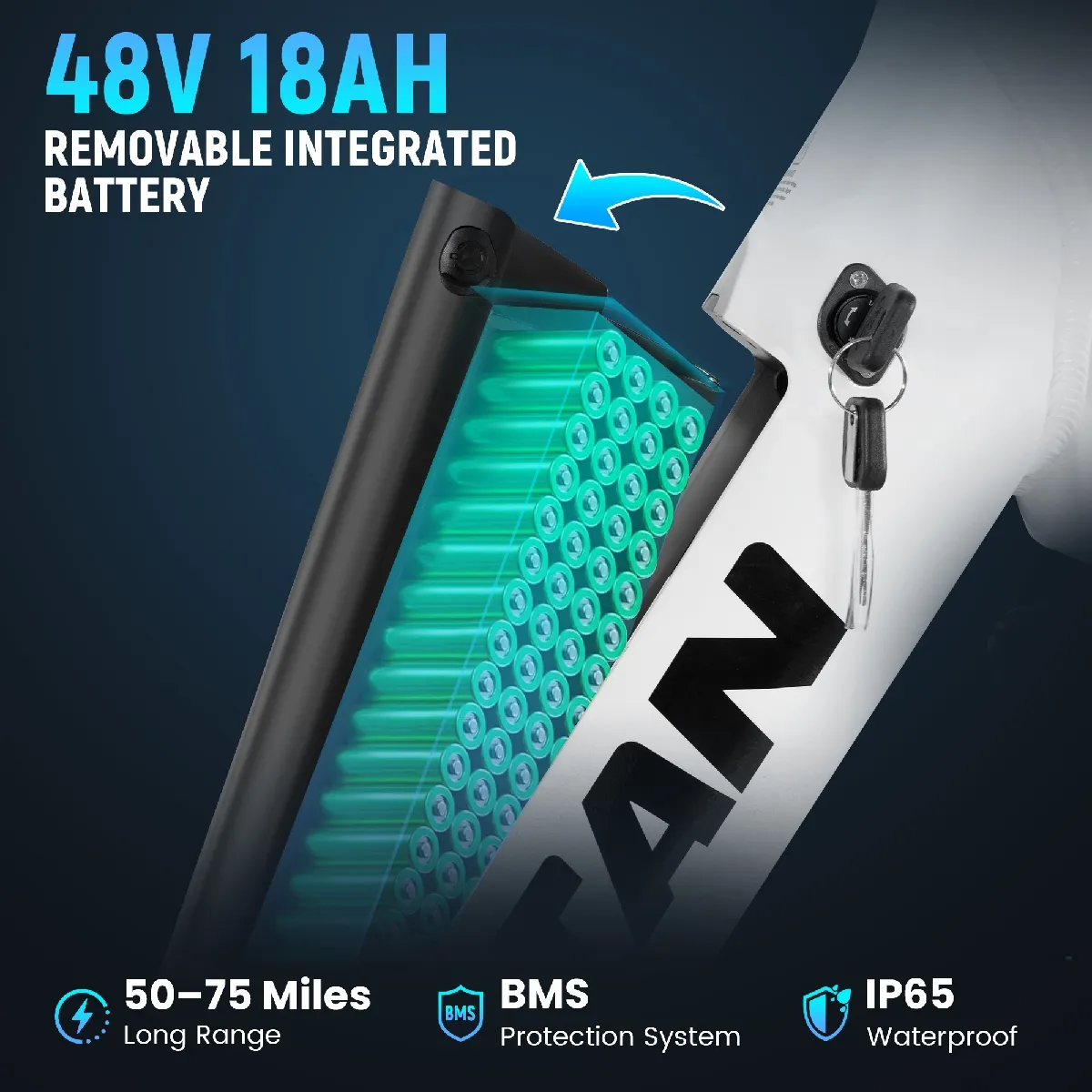 - Batterie intégrée 48 V 18 Ah (864 Wh) Jusqu'à 120 km d'autonomie