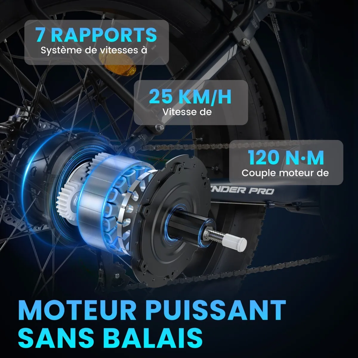 Équipé d'un moteur de moyeu arrière sans balais de 48 V délivrant jusqu'à 120 Nm de couple, le Pathfinder Pro offre une accélération franche et une ascension sans effort sur les pentes raides, le sable, la neige ou les sentiers de montagne, tout en restant silencieux et fluide pour une utilisation urbaine.