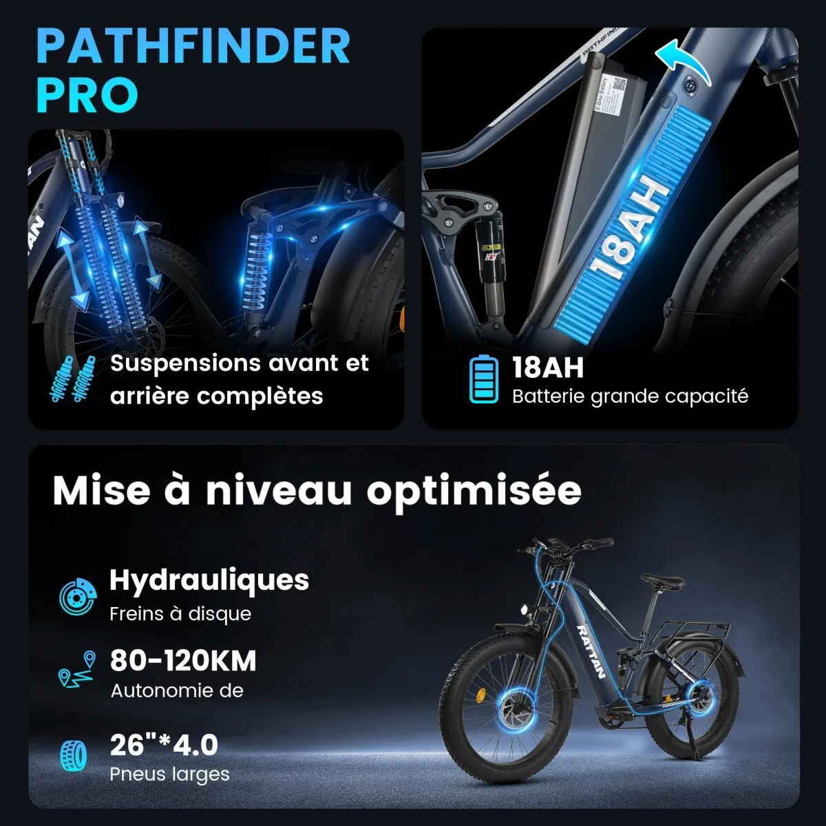 Vélo Électrique RATTAN Pathfinder Pro 26” Fat Bike – Batterie 48V 18Ah, Moteur 120Nm, Bleu