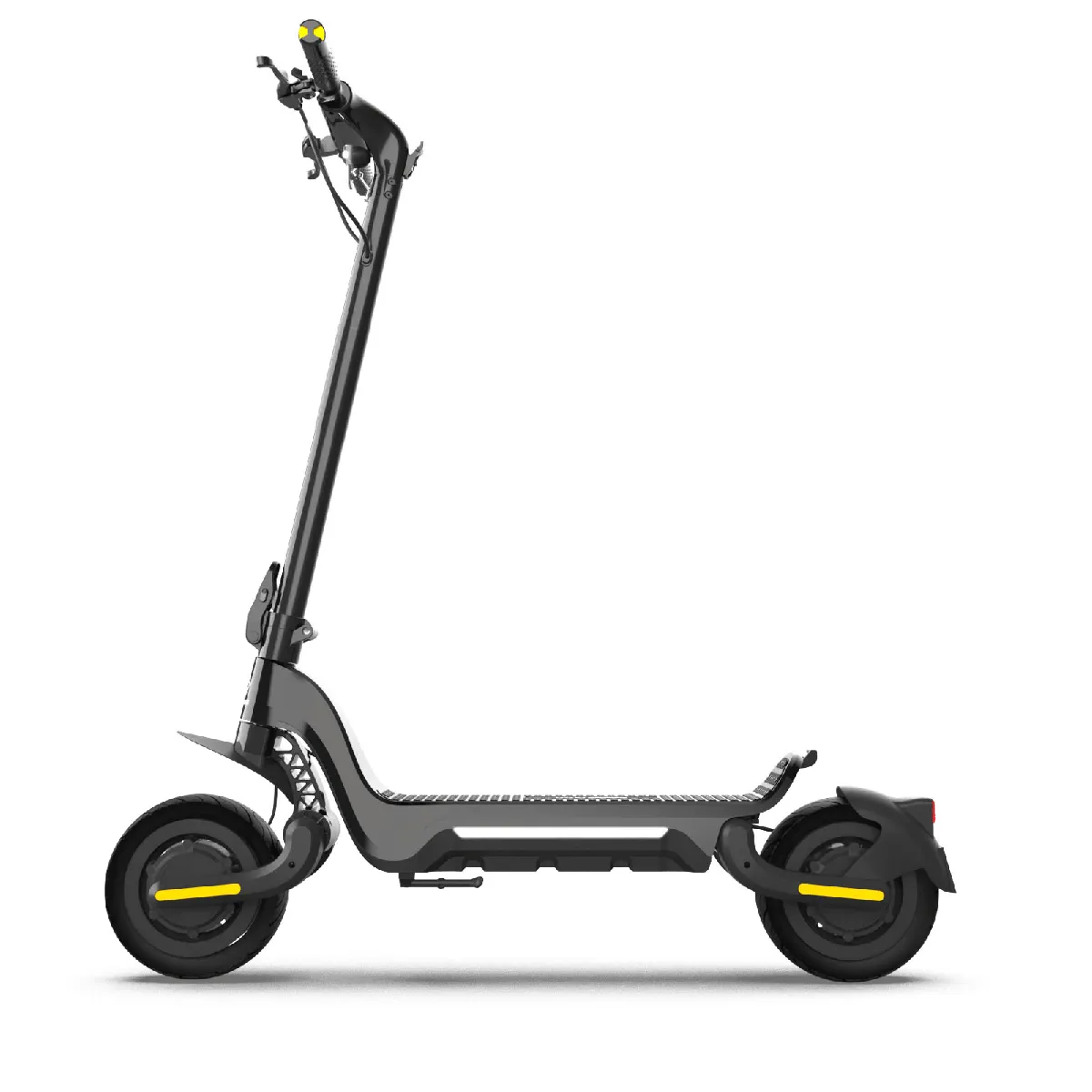 Profitez d'un confort optimal grâce au système d'amortisseurs en polyuréthane (PU) et aux pneus tout-terrain de 10 pouces. Cette combinaison absorbe les irrégularités. La sécurité est prioritaire avec un frein à disque performant et un éclairage complet (feux avant, arrière et latéraux).