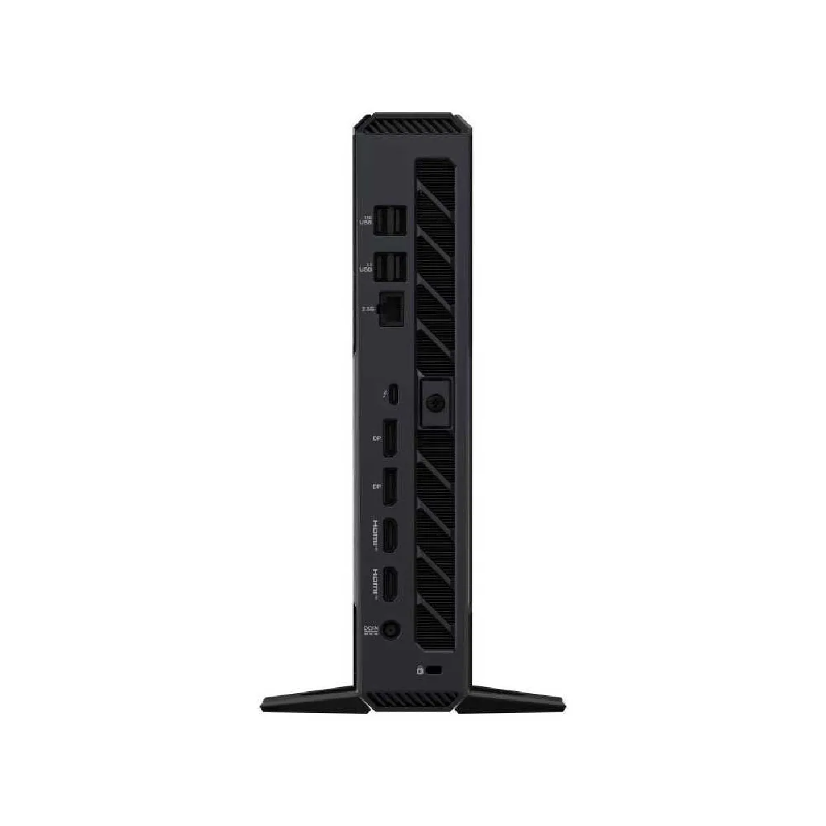 - Ports détaillés : USB-A en façade (4 en partie supérieure), USB-C en façade (1 en position médiane), 5 ports USB à l'arrière, connecteurs d'affichage empilés et indications visuelles près des ports pour faciliter le branchement.