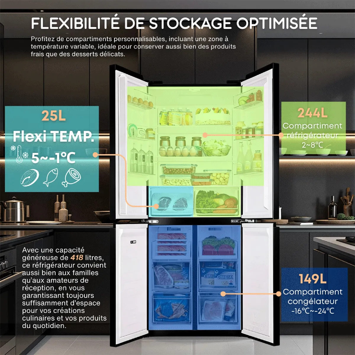 Ce réfrigérateur multi-portes 4 portes Linarie LSCD430BLACK vous offre une grande capacité de conservation de 418 litres avec un design élégant !