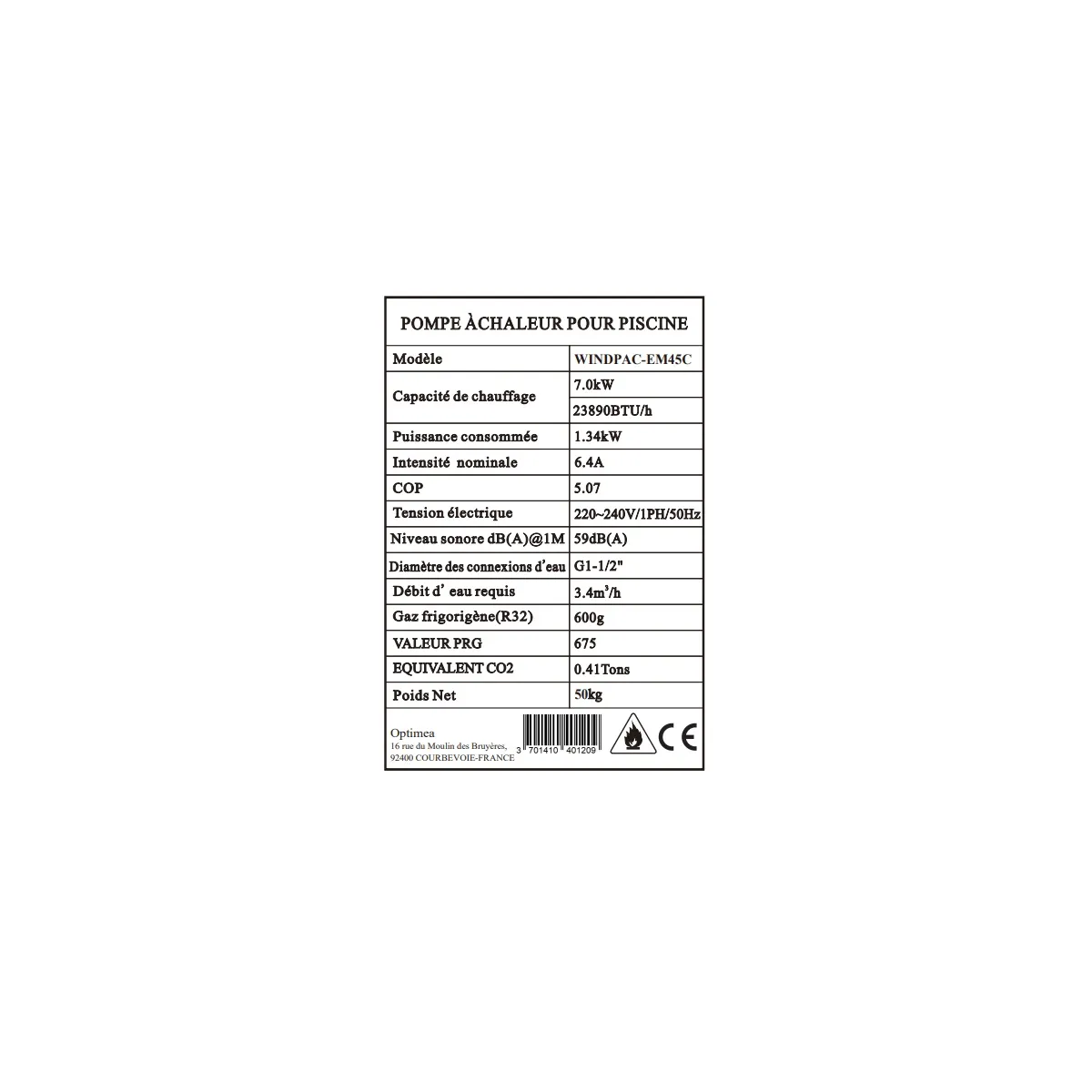 Pompes à Chaleur Piscine Monophasé 7000w - WINDPAC-EM45C - Les nouvelles Pompes à chaleur piscine WINDPAC-EM55C de la marque Optimea prolongent lutilisation de votre piscine davril à octobre. Chauffez leau de votre piscine dès les premiers beaux jours et maintenez la montée en température grâce à lefficacité de sa pompe à chaleur qui va absorber les calories de lair pour chauffer leau de votre piscine.