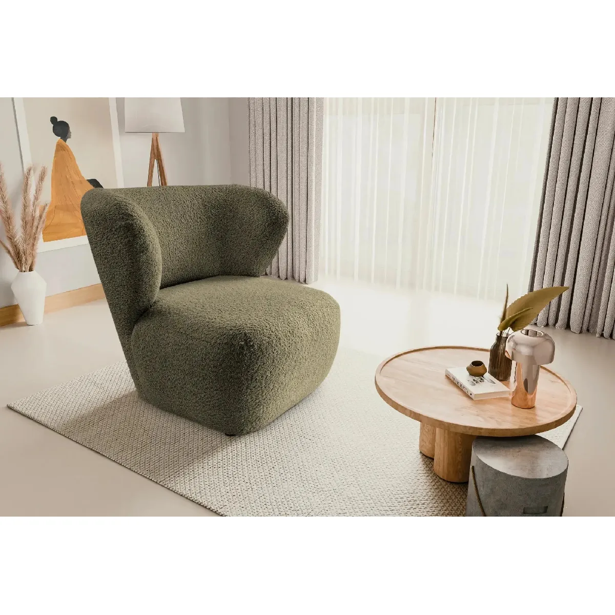 Le fauteuil CAPRI incarne la douceur dans toute sa splendeur. Avec ses formes arrondies et son revêtement en bouclette grise, il évoque un nuage moelleux qui invite instantanément à la détente.Ses proportions généreuses, ses accoudoirs enveloppants et ses pieds en bois discrets en font un véritable cocon, aussi confortable questhétique. CAPRI sintègre aussi bien dans un intérieur contemporain que bohème, apportant une touche chaleureuse et sculpturale.Un fauteuil au charme réconfortant, qui transforme chaque instant en moment de bien-être absolu.