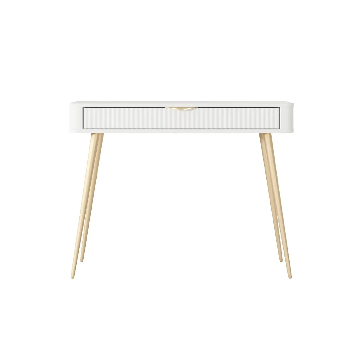 Le bureau JOUDY combine élégance moderne et fonctionnalité quotidienne. Sa façade finement rainurée, sa silhouette arrondie et ses pieds métalliques dorés lui donnent une allure raffinée, idéale pour un espace de travail apaisant et tendance. Compact mais pratique, il intègre un large tiroir discret permettant de ranger documents, accessoires et fournitures, tout en conservant un plateau épuré. Un meuble design, lumineux et parfaitement proportionné pour un bureau chic à domicile.