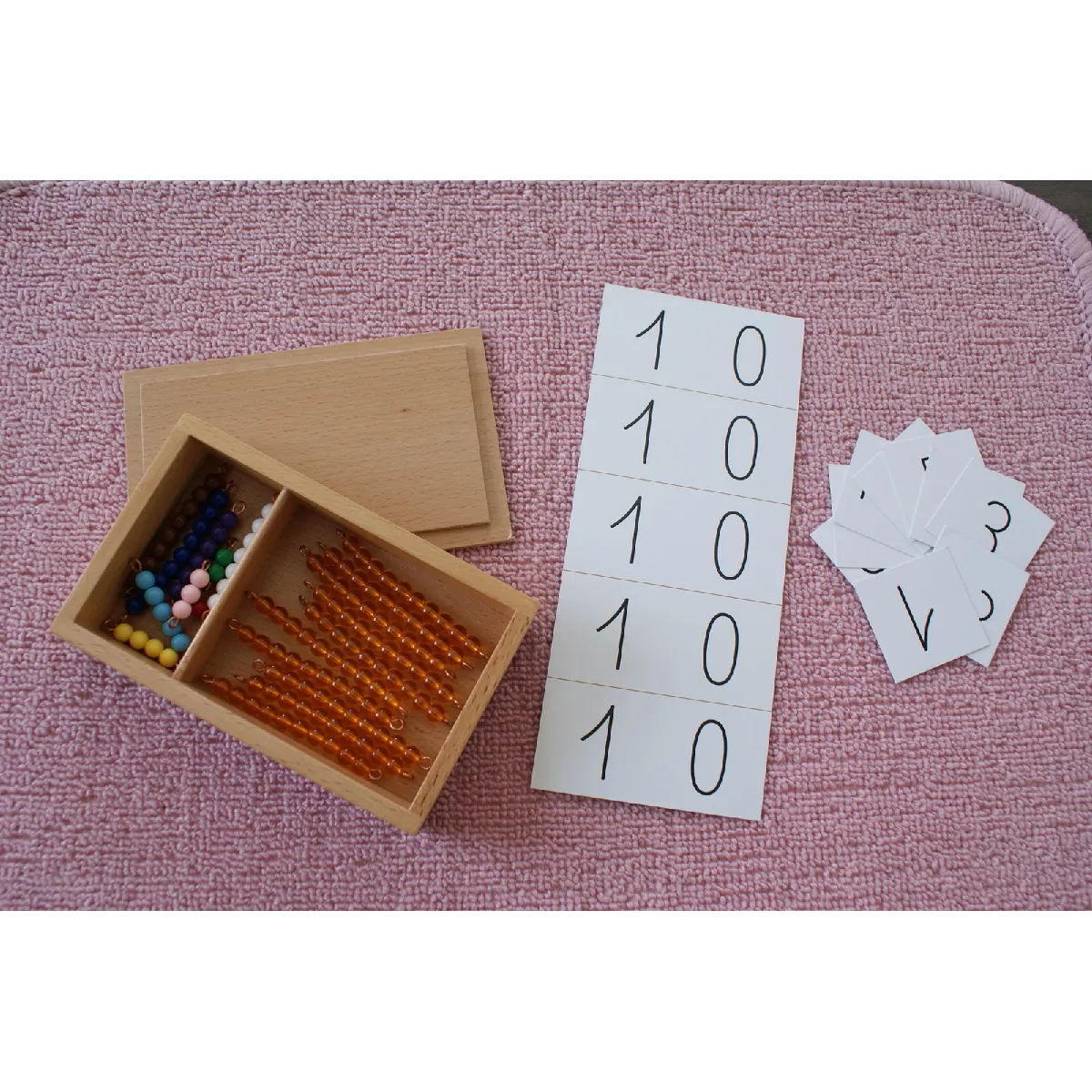 - le matériel pédagogique, comprenant la 1ère table de Seguin, et ses perles colorées et barrettes de 10 associées dans une boîte en bois,