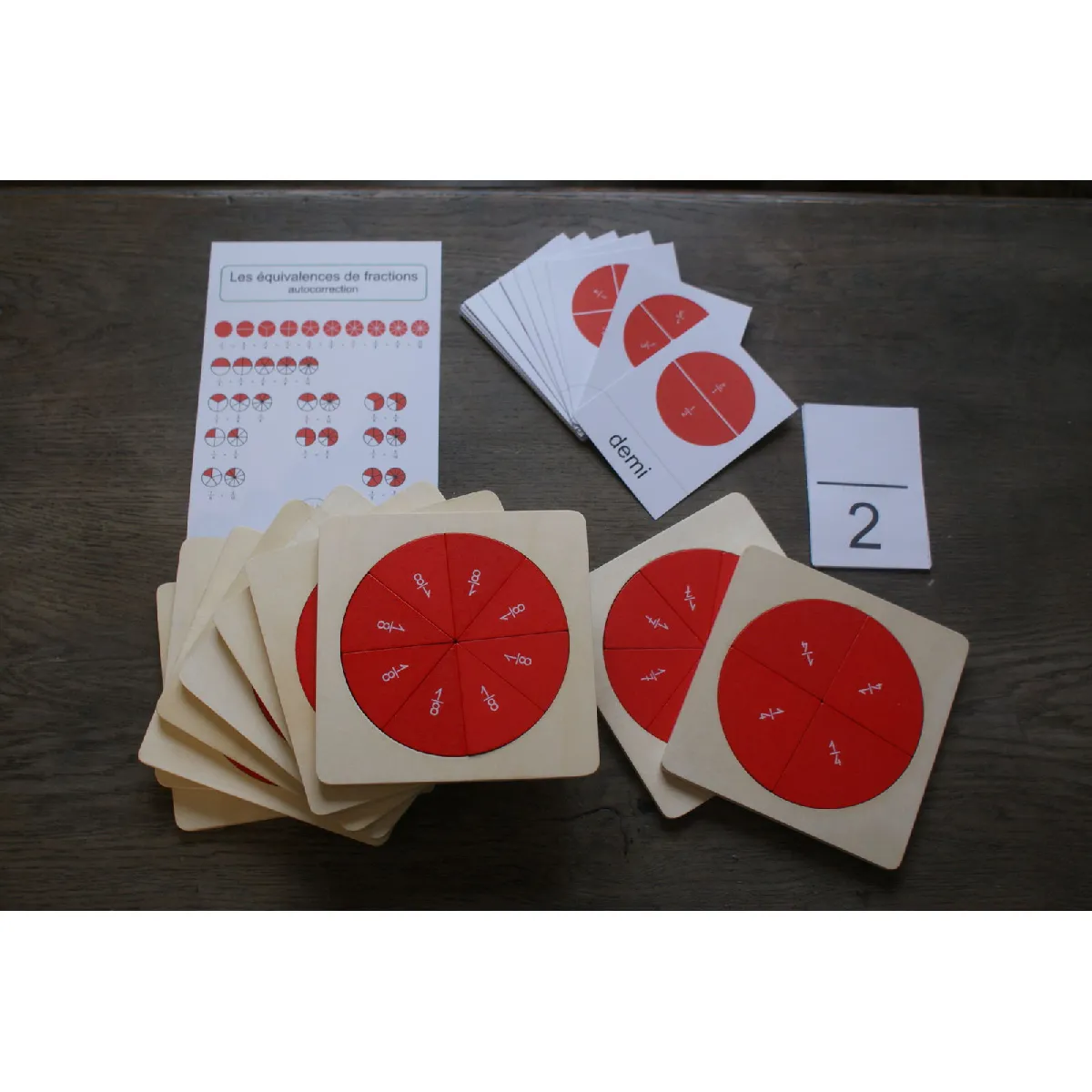 - 10 cercles de fractions rouges dans leurs encastrements en bois, autocorrectifs au dos, avec les chiffres écrits en lettre avec la police Dumont.