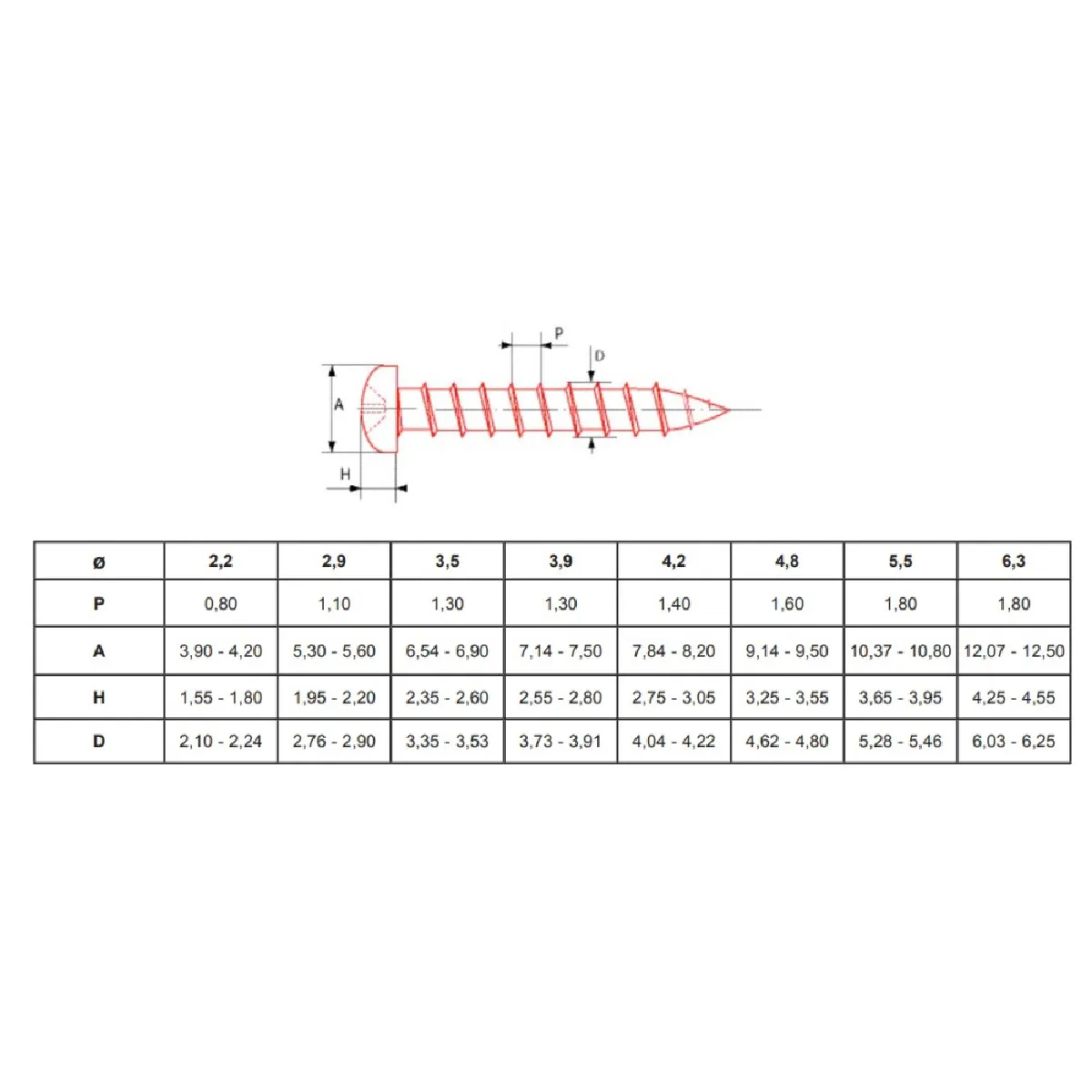 - Diamètre de tête (A) pour 2,2 mm : 3,90 4,20 mm (gamme indicative).