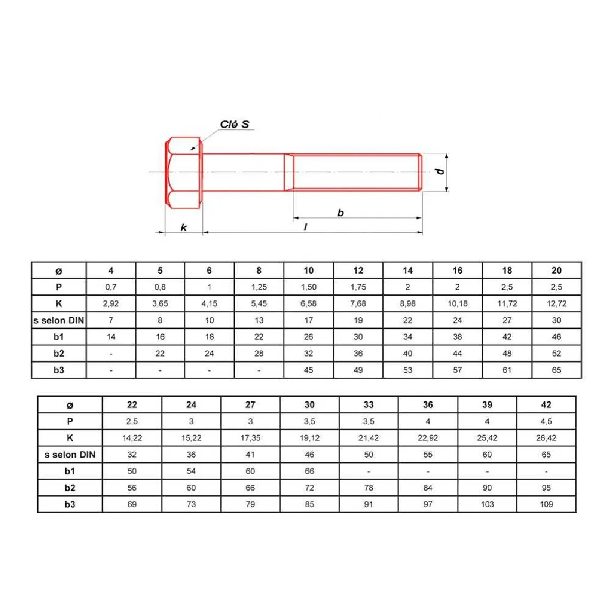 - Longueurs filetées indicatives pour M12 : b1 30 mm, b2 36 mm, b3 49 mm