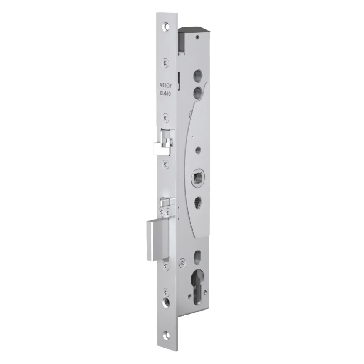 La serrure à béquilles contrôlées ABLOY EL460 est une serrure à encastrer électrique conçue pour portes en aluminium, bois et profil étroit. Réversible pour montage droite/gauche et entrée/sortie, elle permet le remplacement d'une serrure mécanique sans modification de porte. Le marquage visible sur la face avant indique ABLOY EL460 (KEL460100100 pour axe 30 mm / entraxe 92 mm; variante KEL460100110 axe 35 mm).