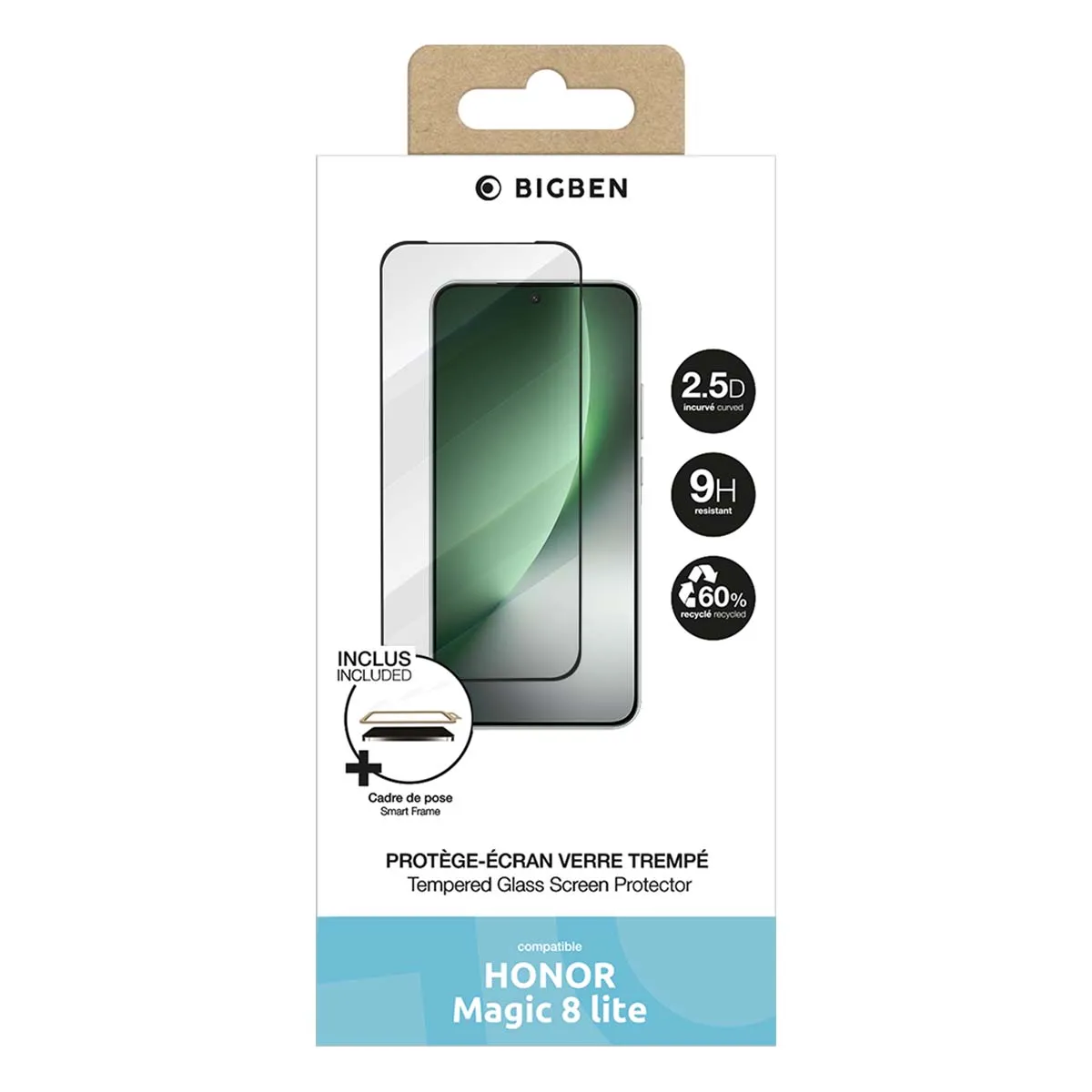 Protègeécran en verre trempé Bigben compatible Honor X5C Plus avec guide de pose SmartFrame intégré pour une installation simple et précise. Verre 2.5D haute résistance avec revêtement oléophobe antitrace pour préserver la sensibilité tactile et la clarté de l'écran. Conçu avec 60% de verre recyclé pour une démarche écoresponsable.