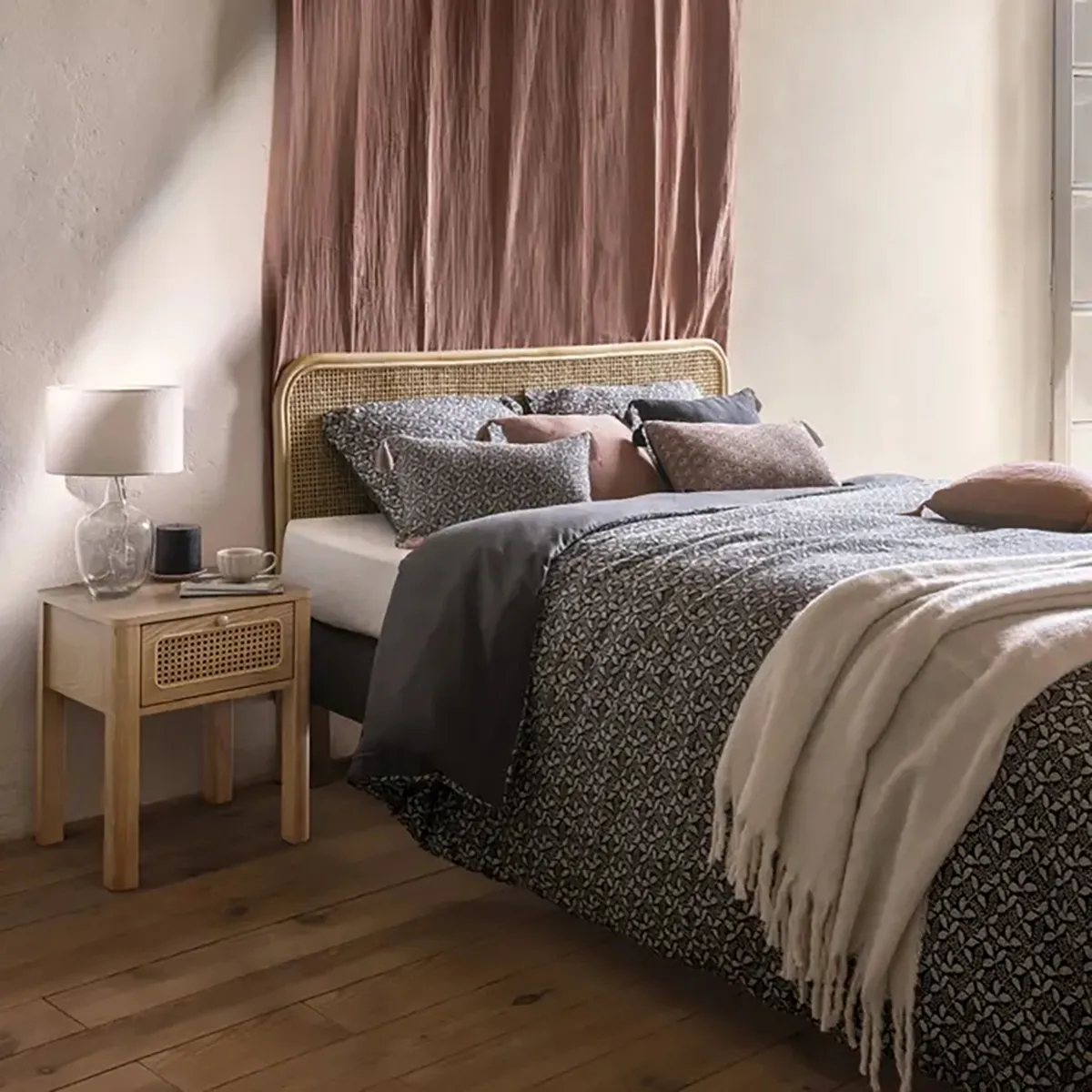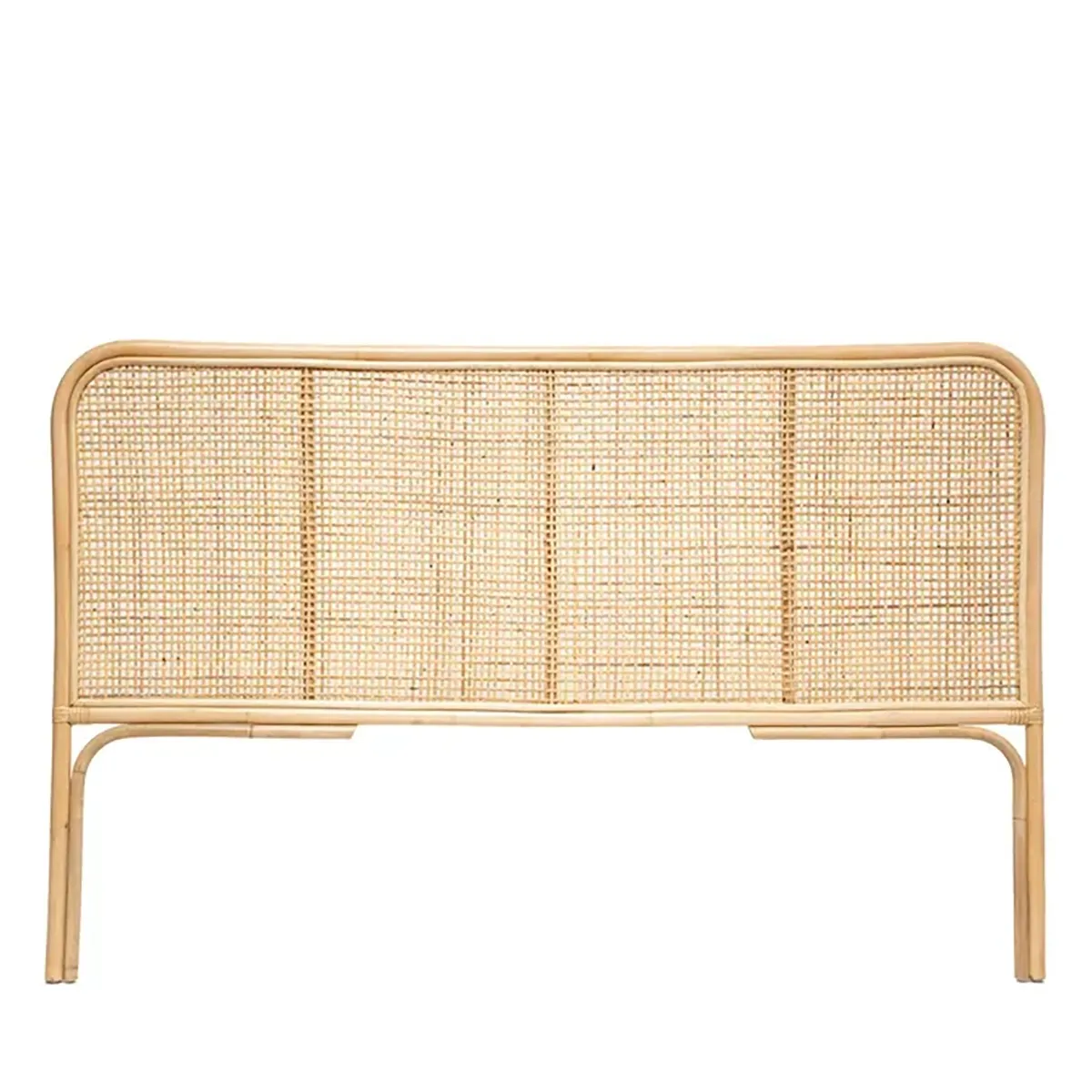 Cette tête de lit fabriquée en rotin naturel, elle offre une ambiance bohème et chaleureuse à la chambre et une grande légèreté visuelle.