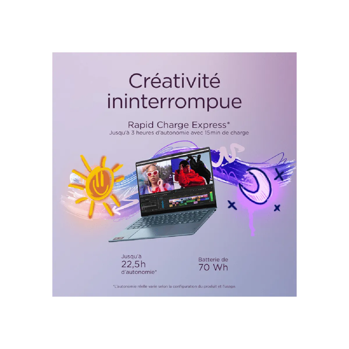 - Batterie : Lithiumion 70 Wh, Rapid Charge Express (jusqu'à 3 heures d'autonomie en 15 minutes de charge), autonomie annoncée jusqu'à 22,5 heures selon usage.