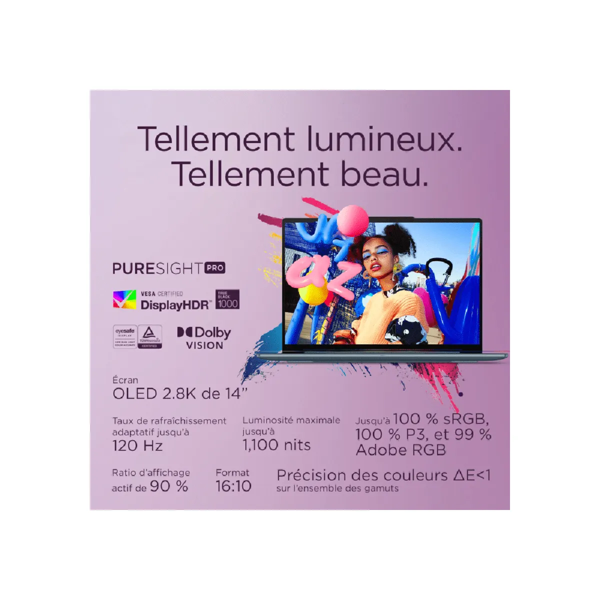 - Écran OLED 14" WUXGA 1920 x 1200, 16:10 jusqu'à 120 Hz adaptatif, pic de luminosité 600 nits, VESA DisplayHDR True Black 1000.