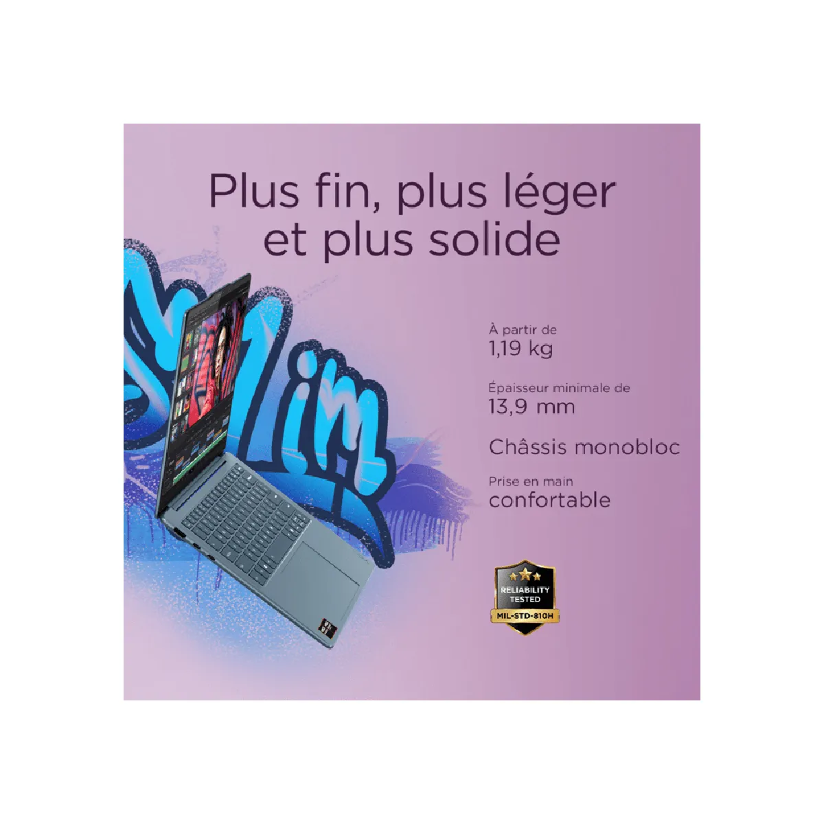 - Mobilité et autonomie : format compact, poids léger et batterie 70 Wh avec charge rapide pour travailler en déplacement.