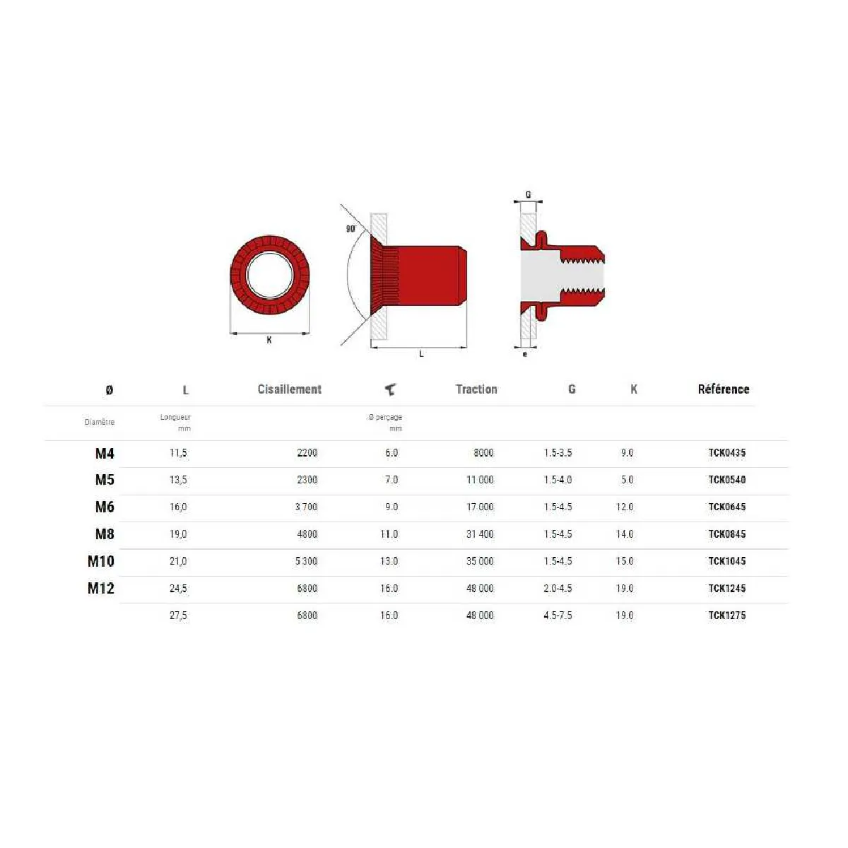 Les écrous crantés TCK0435 sont des éléments de fixation en acier zingué blanc conçus pour offrir une finition affleurante et une tenue durable des assemblages. Leur tête fraisée 90° permet une intégration propre dans la surface, tandis que la partie inférieure crantée assure une excellente résistance au desserrage, notamment en environnement soumis aux vibrations. Conditionnés en boîte de 500 pièces, ils conviennent aussi bien aux applications industrielles que domestiques.