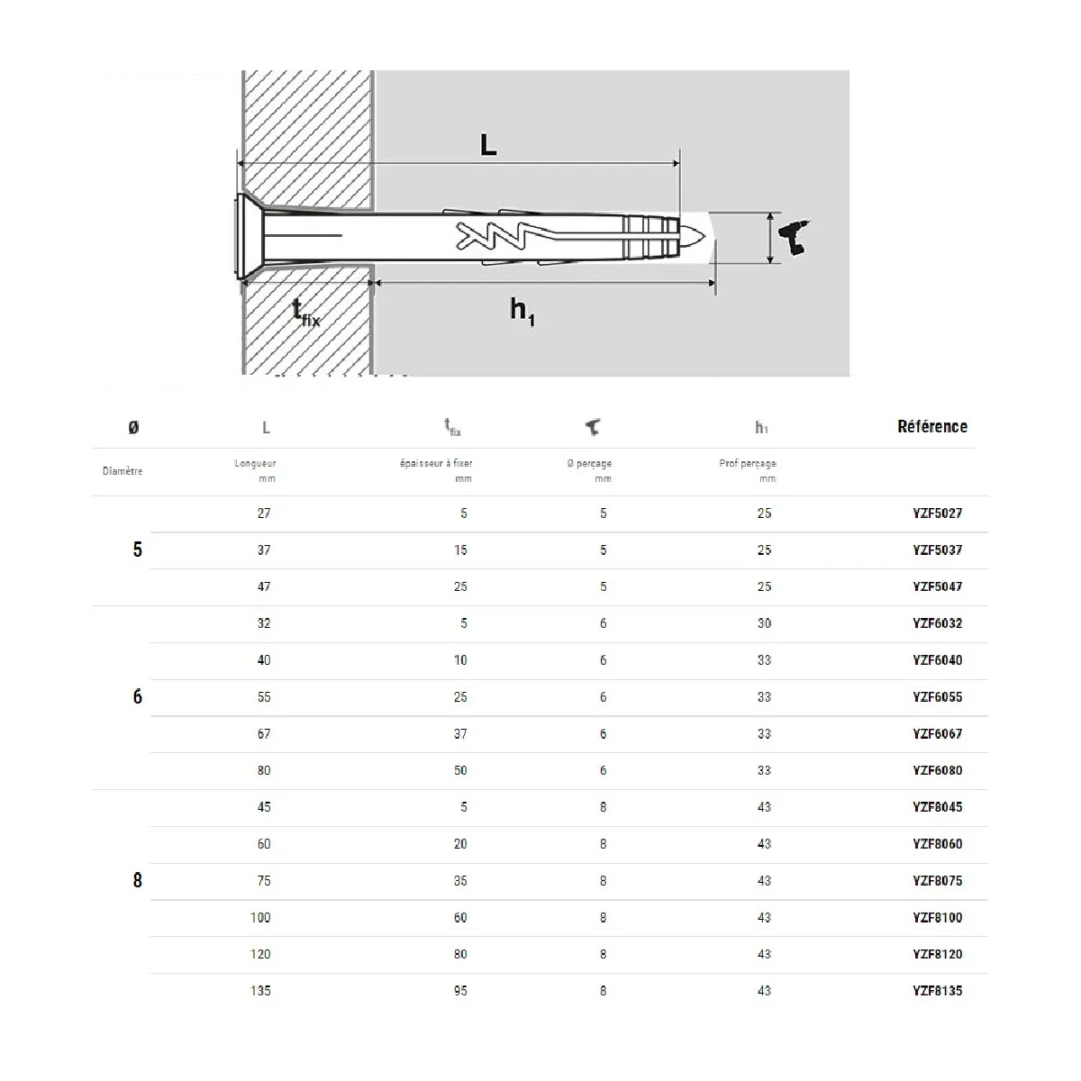 - Perçage recommandé : foret Ø 8 mm, profondeur de perçage recommandée 43 mm.