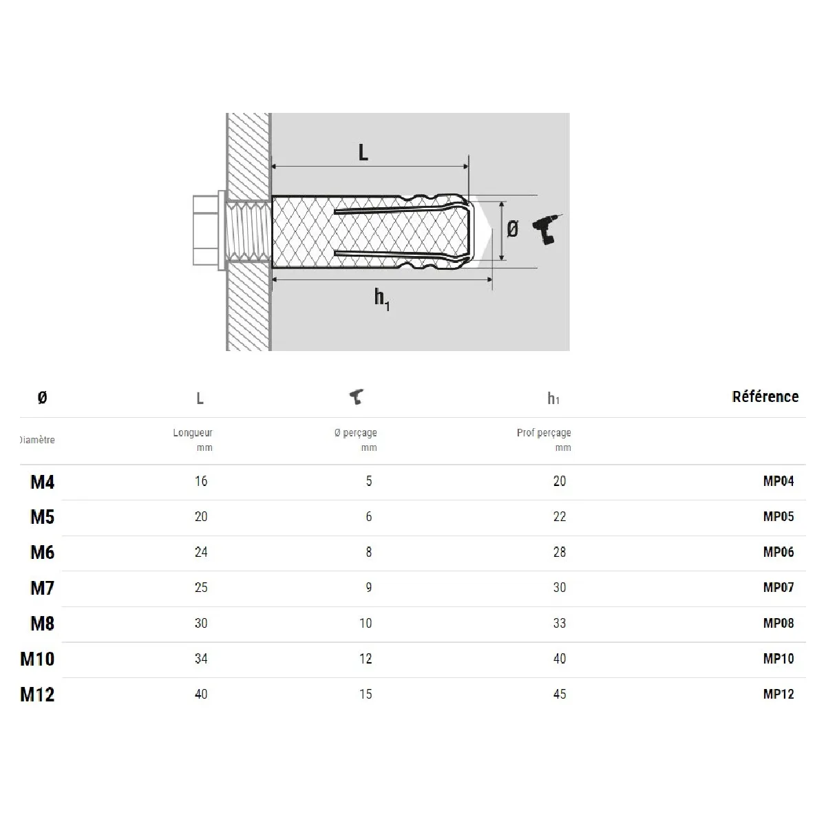 - Profondeur de perçage requise (h1) : 28 mm