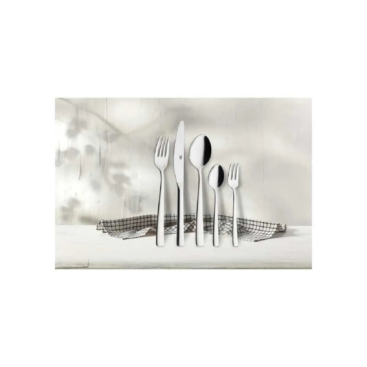- Composition du service : 60 couverts (12 fourchettes, 12 couteaux monoblocs à lame micro dentée, 12 cuillères à soupe, 12 cuillères à café, 12 fourchettes à gâteau)