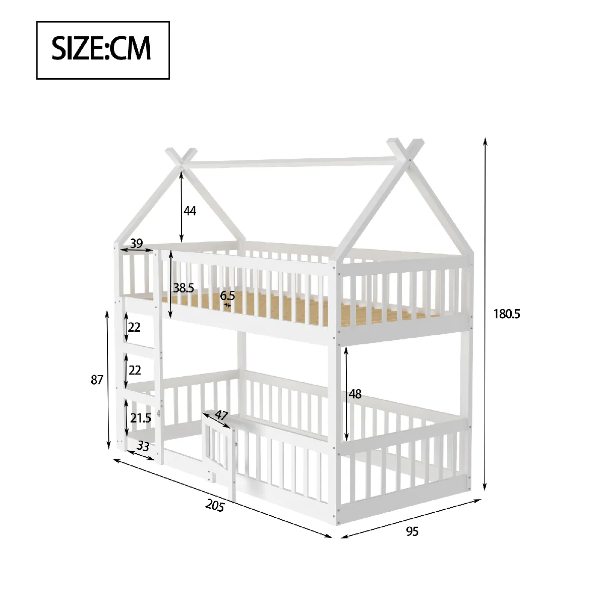 - Fonctions: lit superposé à deux niveaux, escalier intégré, porte ouvrante sur la partie basse, garde-corps de sécurité