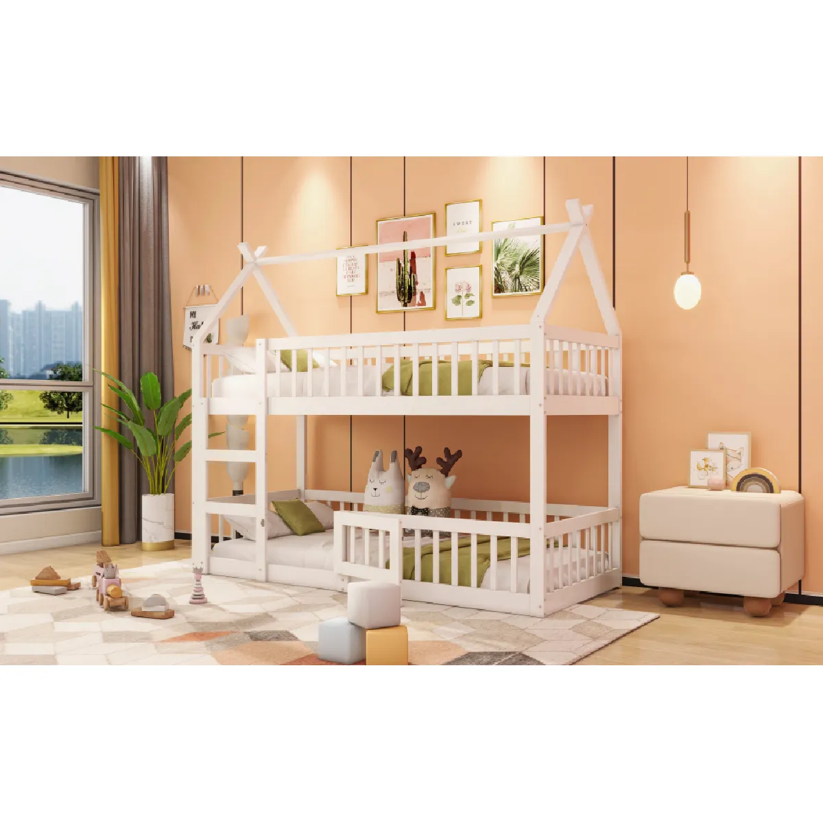 Lescalier intégré facilite laccès au lit supérieur. La structure associe bois, métal, contreplaqué et MDF pour une conception pensée pour la stabilité et lusage au quotidien. Sa finition blanche, intemporelle, saccorde facilement avec la plupart des décorations de chambre denfant.