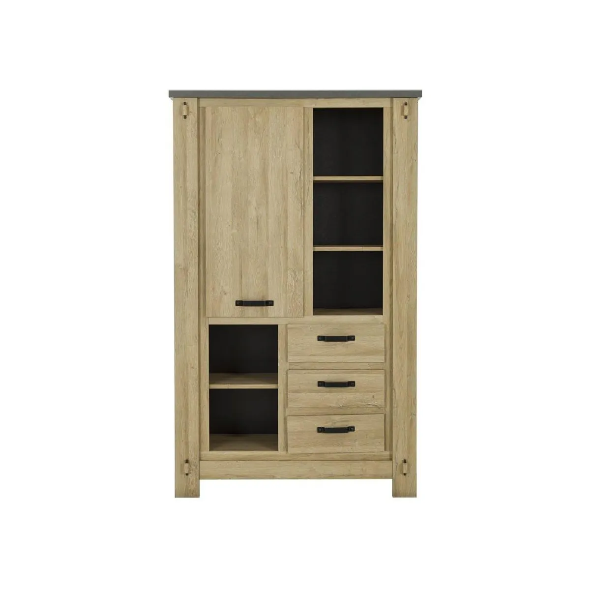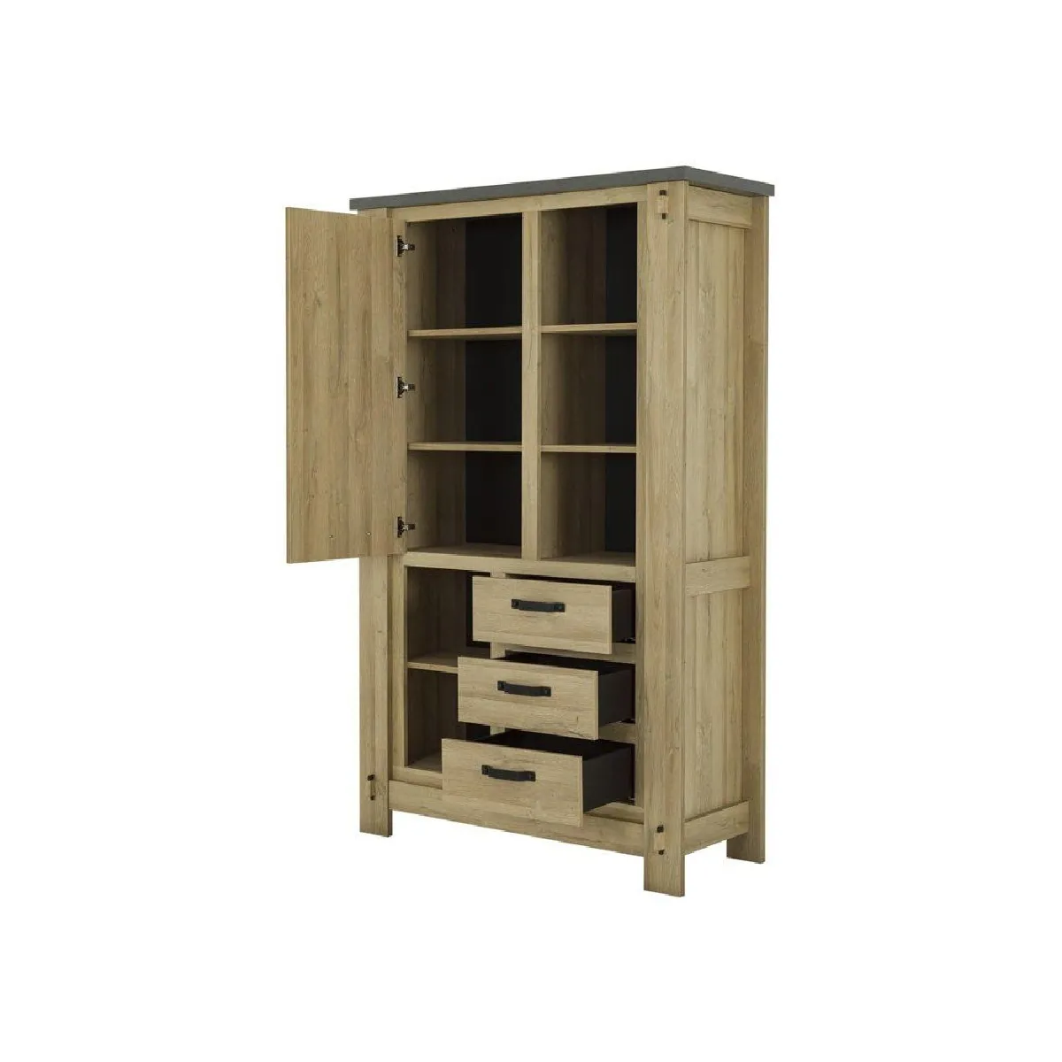 - Agencement interne : section supérieure gauche avec étagères en colonne double derrière la porte, colonne droite ouverte avec trois étagères; partie inférieure gauche avec deux étagères carrées ouvertes; partie inférieure droite composée des trois tiroirs