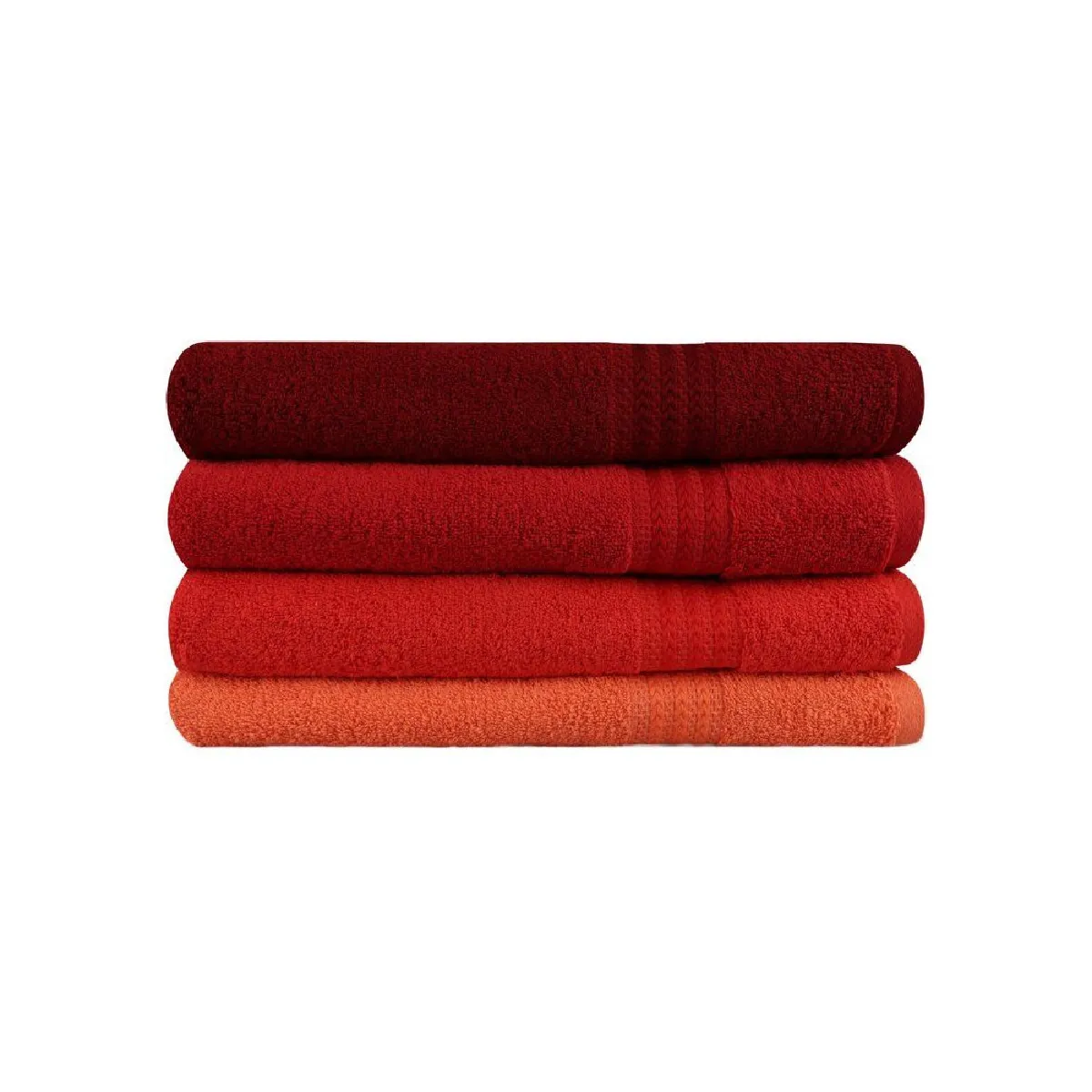 Lot de 4 serviettes de bain orange, dimensions 70 x 140 cm, conçues pour un usage quotidien en salle de bain. Fabriquées en 100% coton, ces serviettes en éponge offrent une sensation douce et moelleuse tout en assurant un séchage efficace après la douche ou le bain. Présentées pliées et empilées, elles apportent une touche de couleur unie et un style moderne discret grâce à une bande tissée décorative horizontale près des bords.