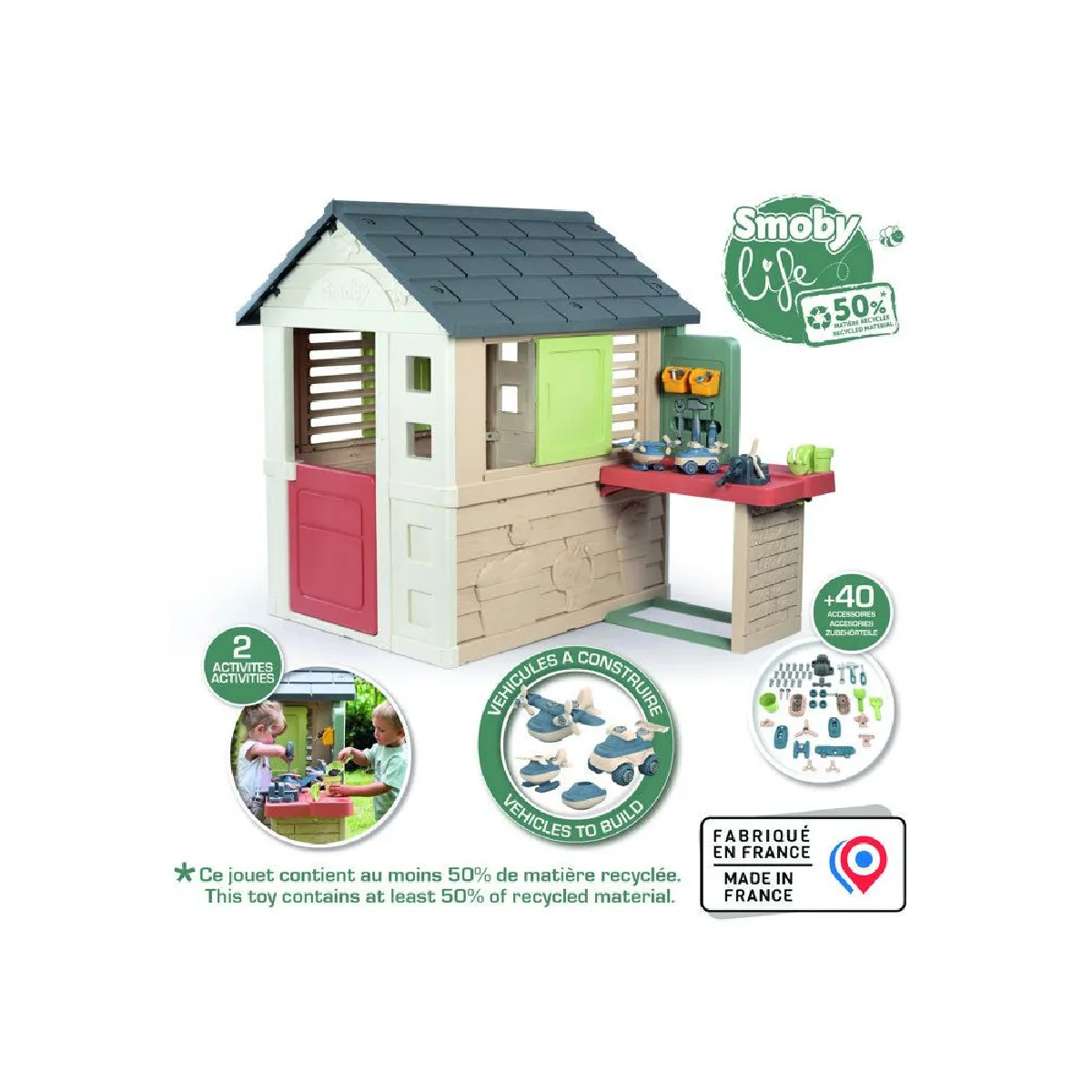 SMOBY Maisonnette Life Nature avec atelier et 39 accessoires - Matière recyclée anti-UV - Dès 2 ans - Fabriqué en France